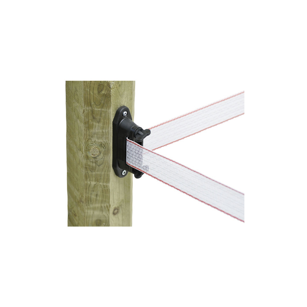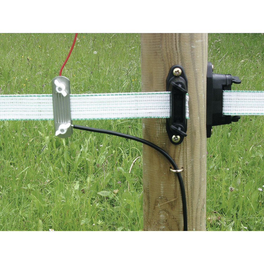 Isolator für das Eck oder auch für Strecken geeignet. Elektrisch leitende Gummieinlagen durch Kohlefasern (patentiert) fixieren das Band sehr schonend und zuverlässig. Die Isolatoren sind rutschfest durch versetzte Gummiprofile, einsetzbar als Anfangs- oder Abspannisolator und ermöglichen leichte Montage und einfaches Spannen von Breitbändern. Für Litze, Seil und Band bis 40 mm. 10 Stück/Packung