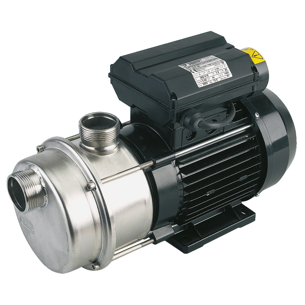Lebensmittelechte Profi-Pumpe aus rostfreiem Stahl. Ideal zum Fördern von Wein, Most, Milch usw. Leistung 43 L/min., Motor 0,44 kW, 230 V, Förderhöhe 10 m, Temperatur max. 90 °C, gefüllt selbstsaugend bis 6 m, Anschlüsse 1″ AG.