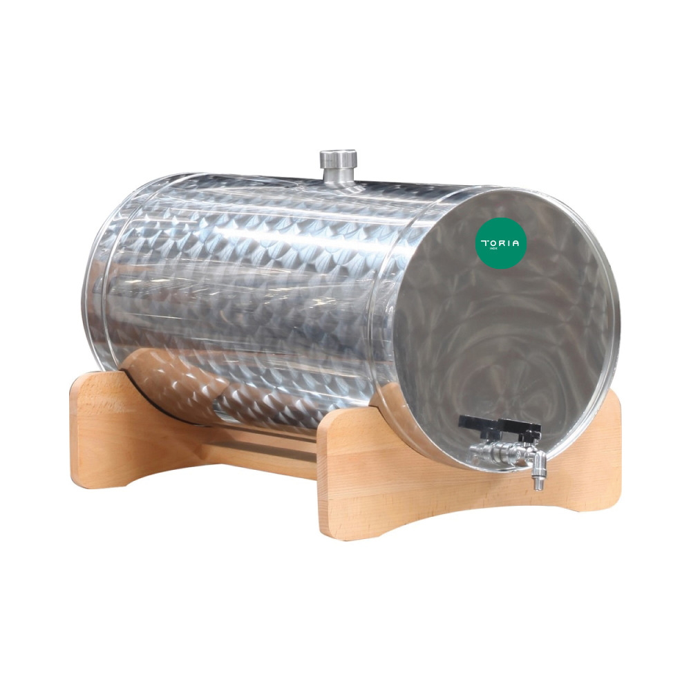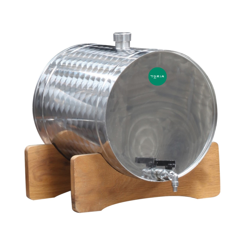 Praktisches Lager- und Ausschankfass aus Edelstahl 1.4301 mit stabiler Holzauflage und Kugelauslaufhahn 3/8“. Einfüllstutzen 1“ mit Schraubgewindedeckel. Wandstärke 0,6 mm. Geeignet für Wein, Schnaps, Öl und Milch.