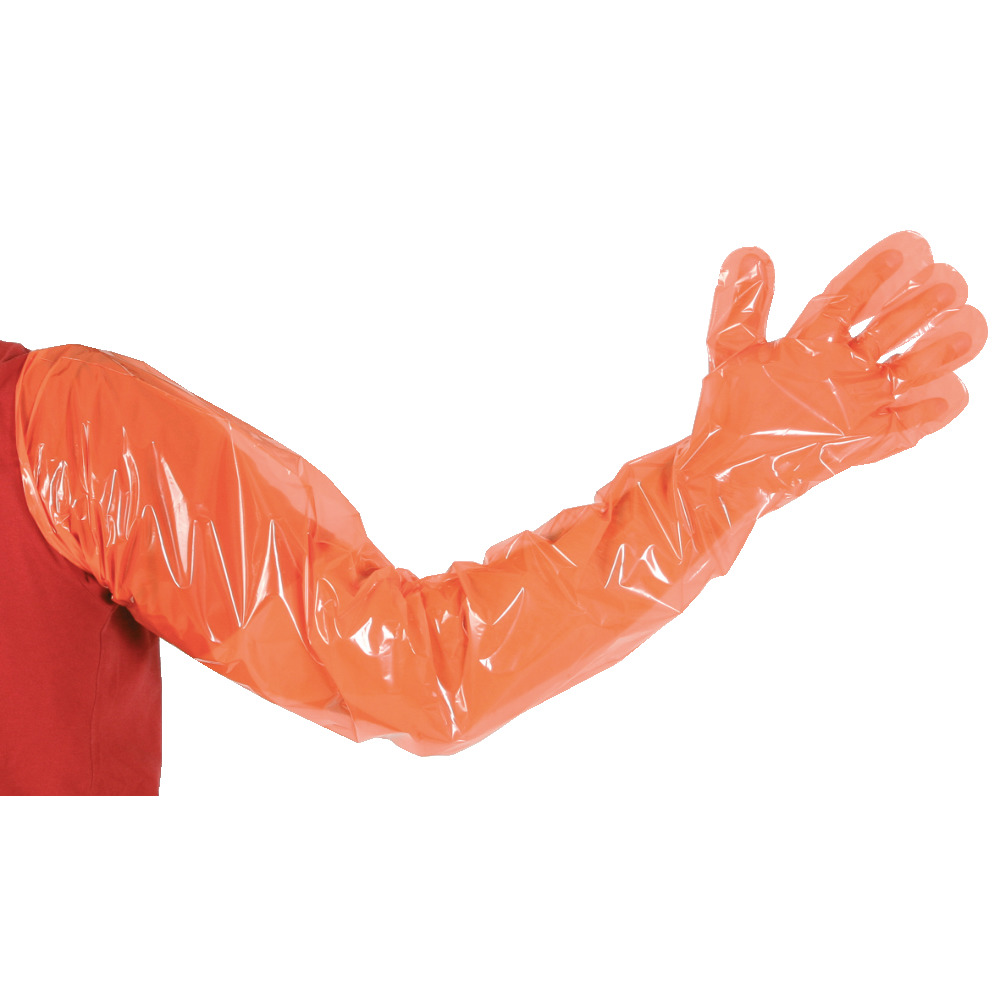 Ideal aus Untersuchungs- oder Besamungshandschuh. Vielfältiger Einsatzbereich: für Landwirte, Veterinäre aber auch als Tankhandschuh geeignet. 90 cm lang, aus Polyethylen, orange, Materialstärke 25 micron = 0,025 mm. Lebensmittelecht, Einheitsgröße. 100 Stück/Packung