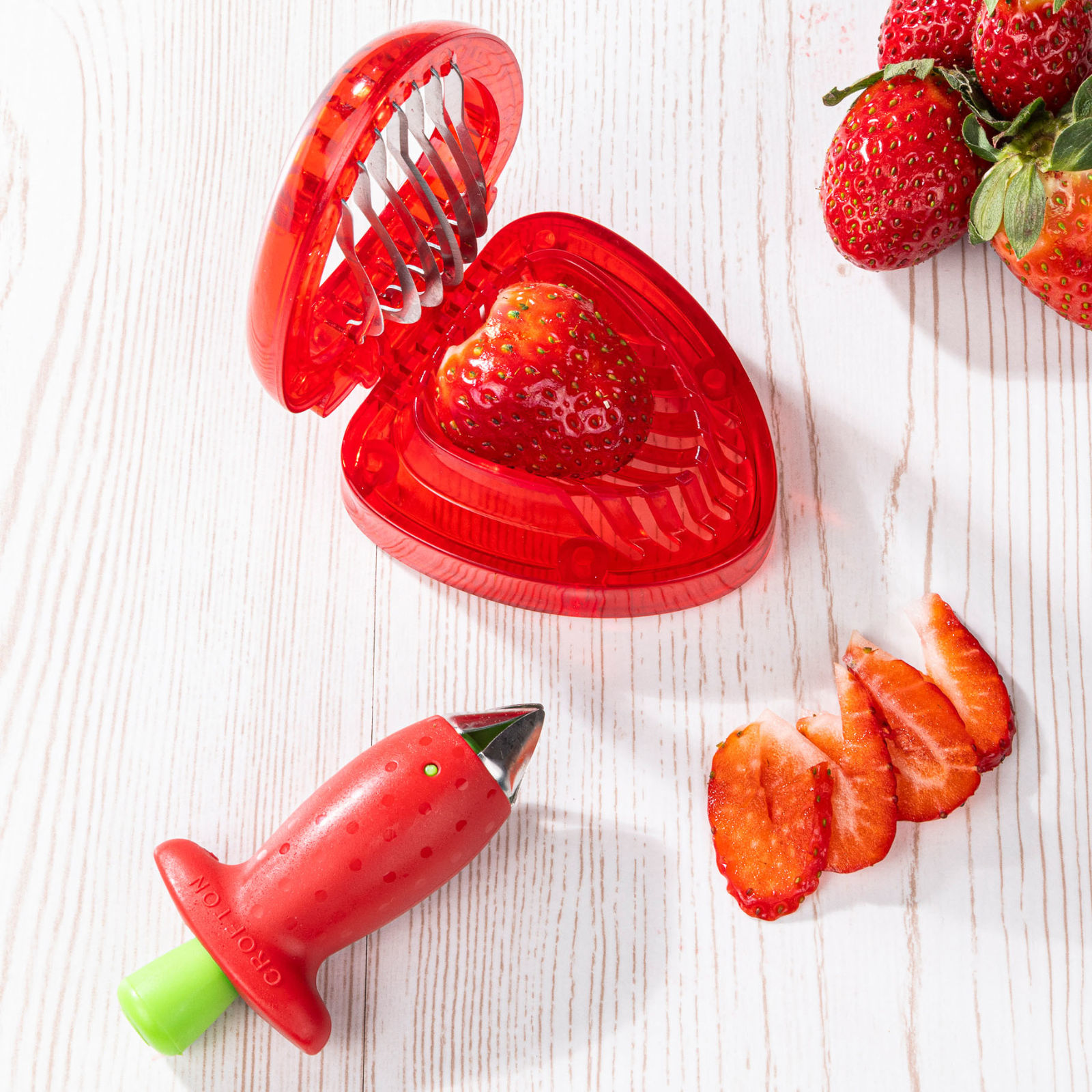 Frische Erdbeeren naschen, dekorieren oder verarbeiten war noch nie so einfach! Mit diesem kompakten Duo bereitest du deine Lieblingsfrüchte im Handumdrehen vor – sauber, schnell und präzise.