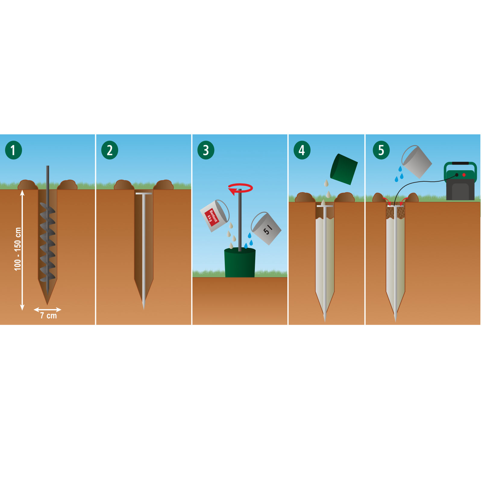 • Massewird sehr einfach und schnell mit 5 Liter Wasser angerührt und in ein für den Erdstab vorbereitetes und entsprechend großes Loch gefüllt
