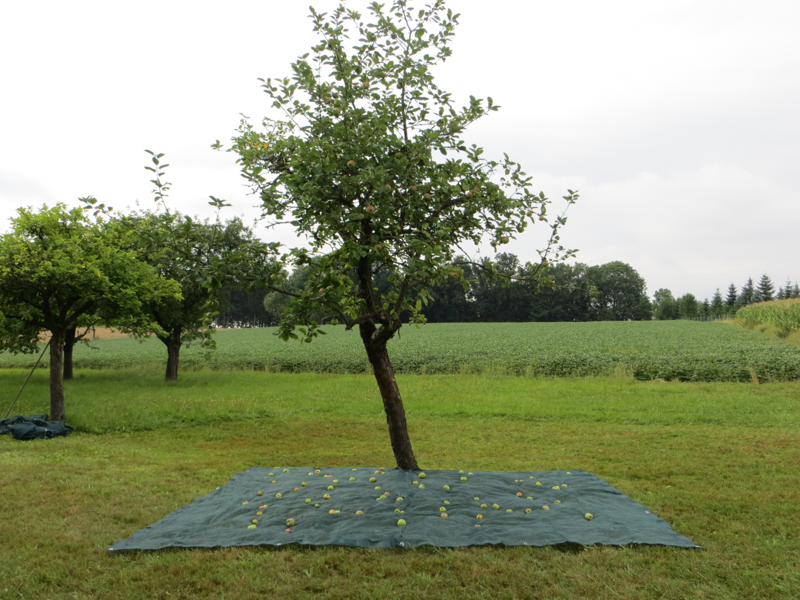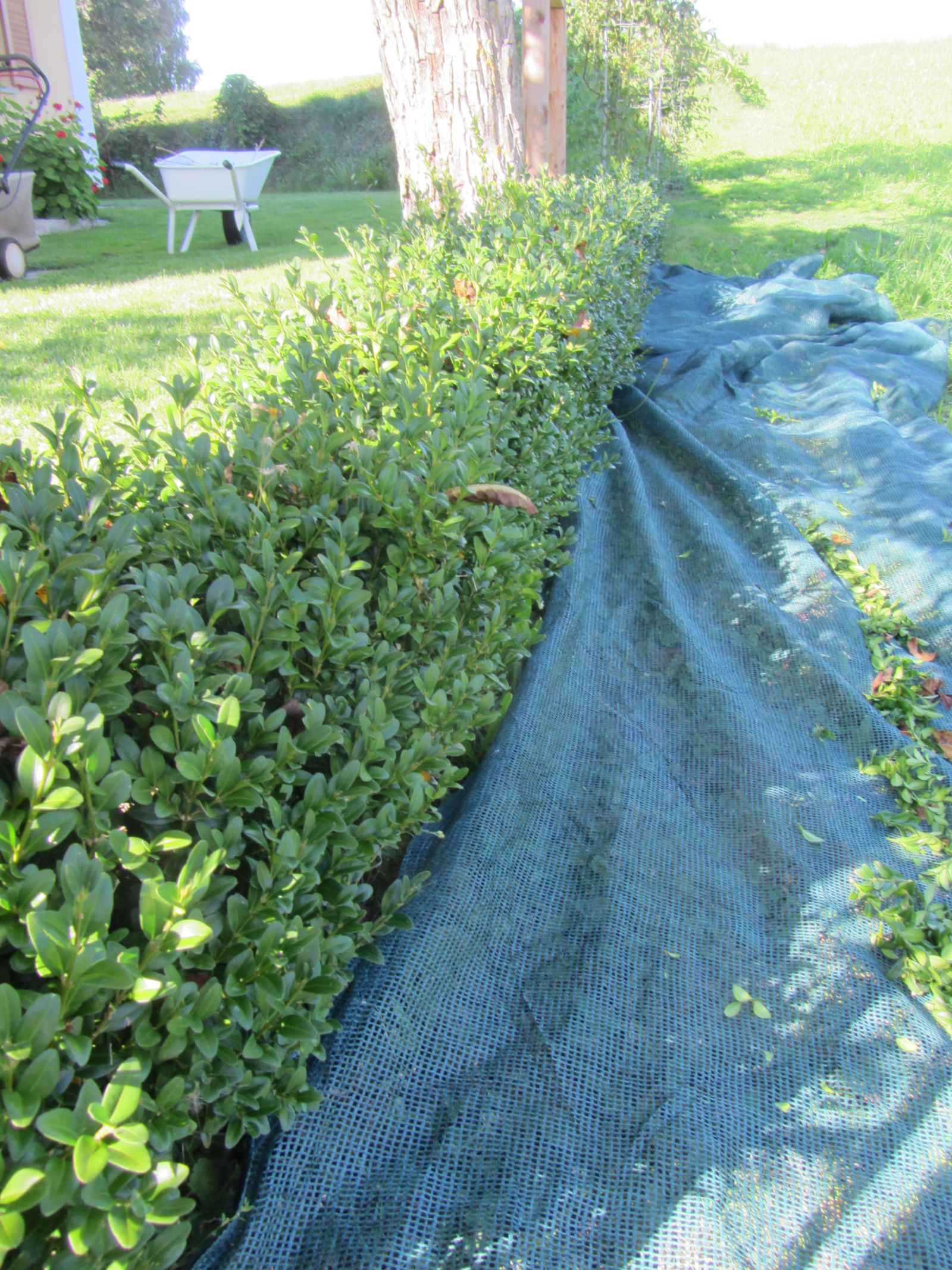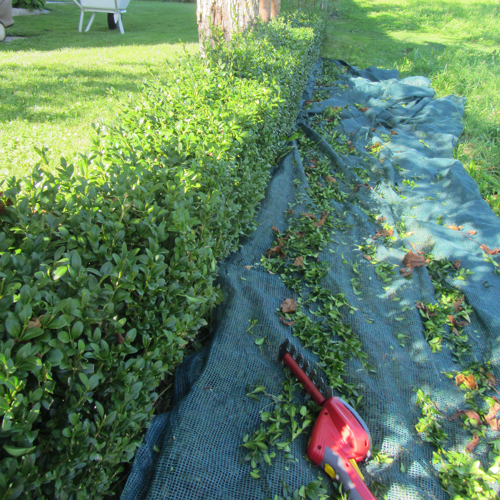 Dieses multifunktionale Netz erleichtert die Ernte von Früchten und Nüssen und dient gleichzeitig als saubere Unterlage bei Strauchschneidearbeiten.