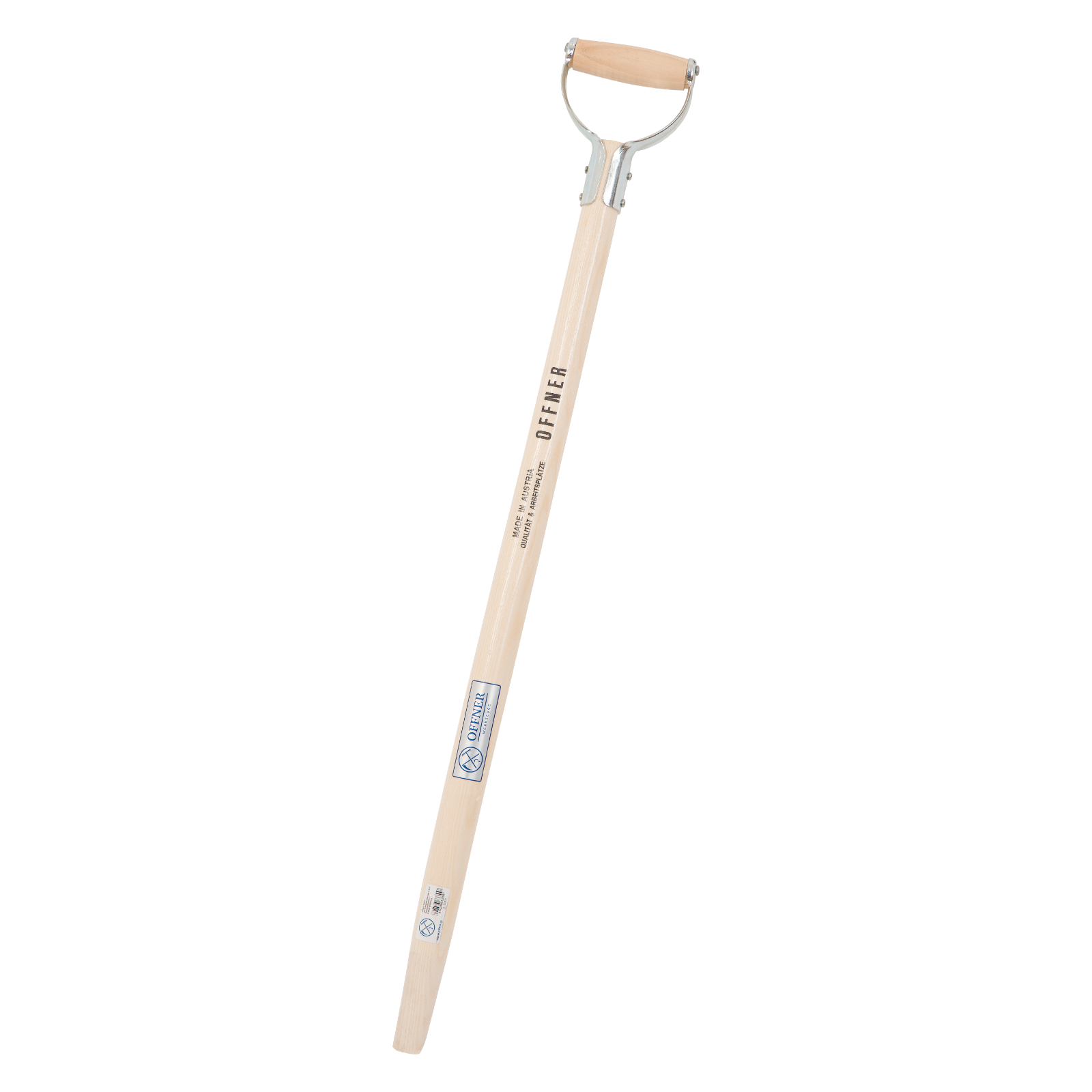 hochwertiger Eschenstiel, gebogen, gebleicht, mit Eisen-D-Griff, Gesamtlänge 94 cm, Konus 27 auf 36 mm.Ersatzstiel für FaieNr. 23797