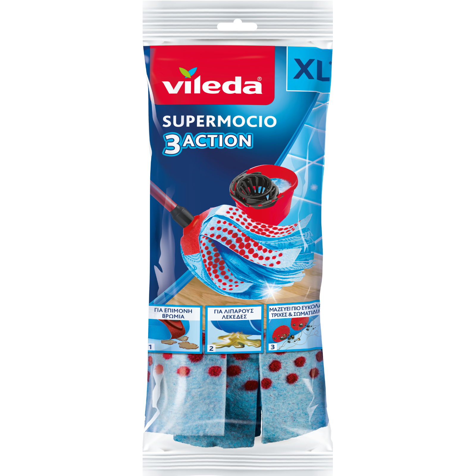 Der 3x Action Ersatzmopkopf für Vileda SuperMocio Systeme überzeugt mit innovativen 3D-Velourfasern, die Schmutz und Partikel effektiv aufnehmen – für bis zu 30 % bessere Reinigungsergebnisse.Zusätzliche blaue Microfaserstreifen lösen selbst fettige Verschmutzungen und Flecken mühelos.Dank Easy Click System lässt sich der Mopkopf schnell und unkompliziert austauschen.Die spezielle Zitronenform sorgt zudem für eine gründliche Reinigung bis in die Ecken.