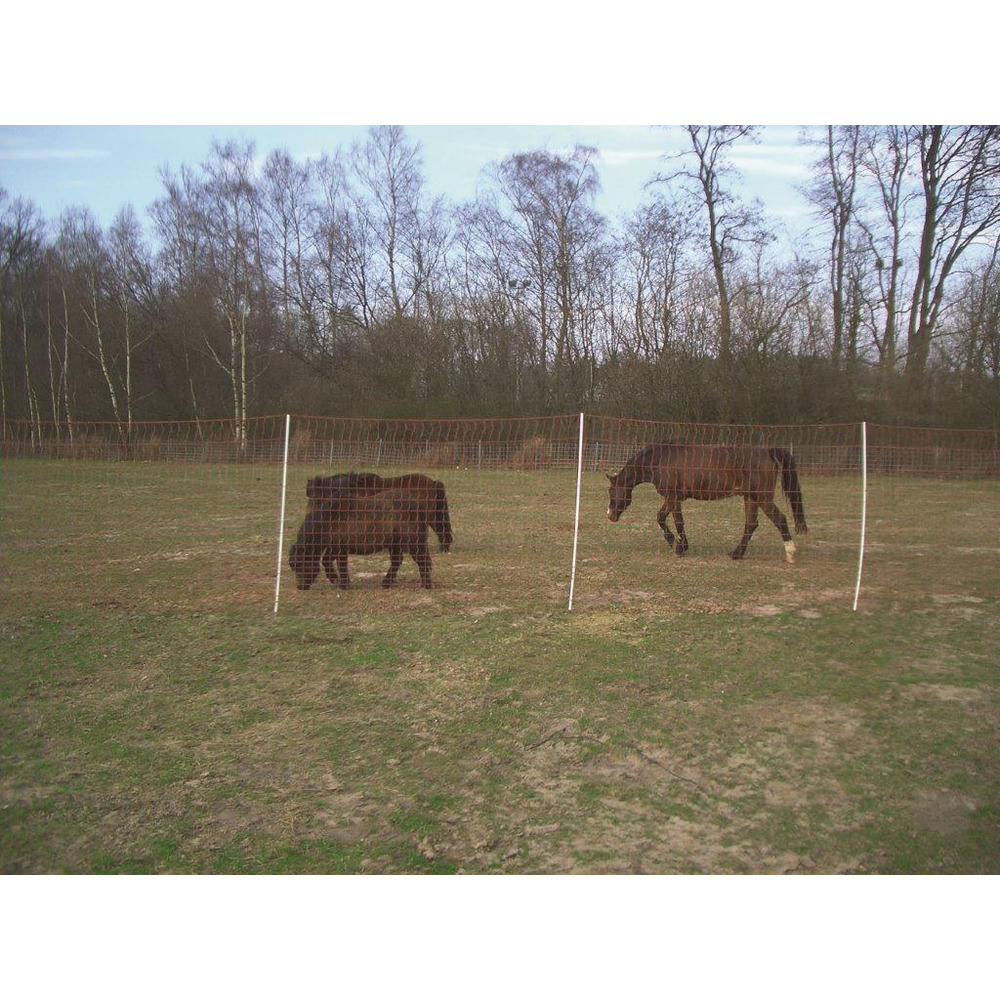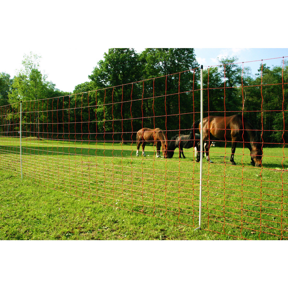 Netz mit einer Höhe von 145 cm, geeignet für Pferde, Esel, Schafe oder auch zur Wolfabwehr. Mit Doppelspitze, Länge 50m, mit engen Maschen. 11 horizontale Litzen, 10 davon stromführend, inkl. 15 Jumbo Pfähle Ø 19 mm.