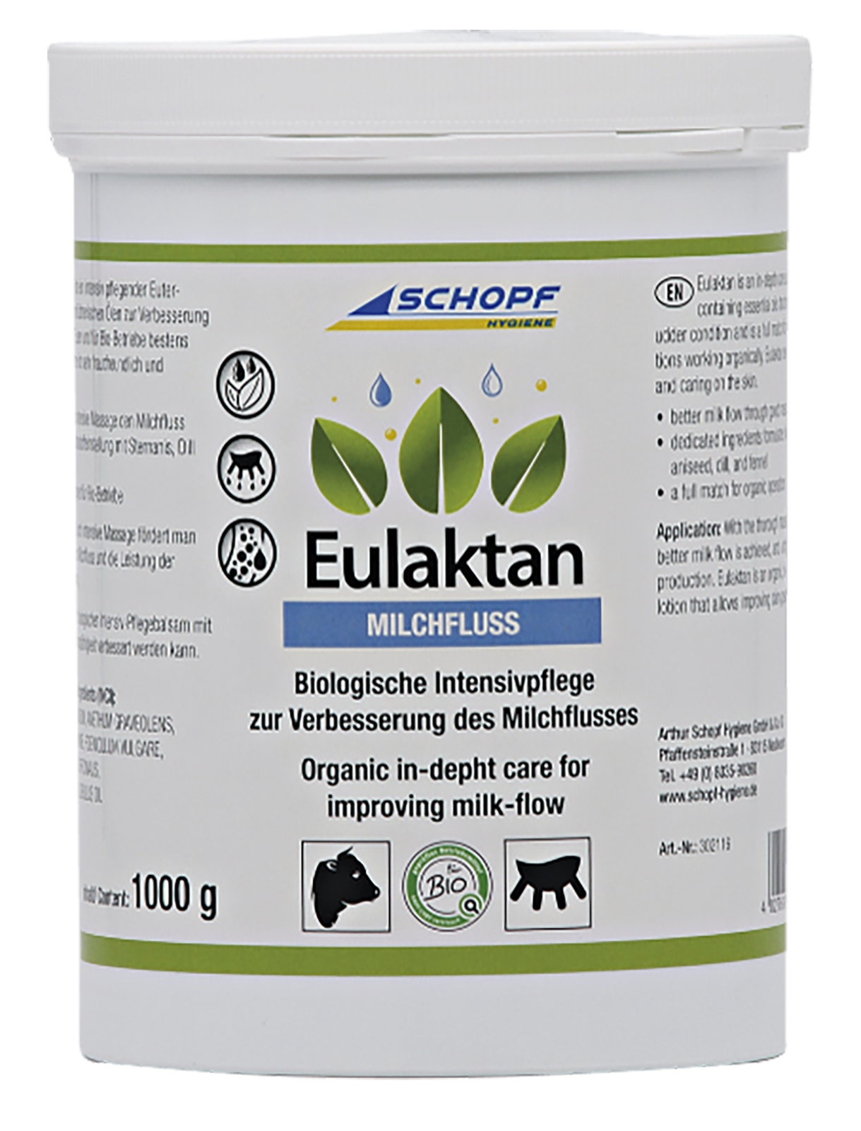 Eulaktan ist ein intensiv pflegender Euterbalsam, der ätherische Öle enthält und speziell für Bio-Betriebe geeignet ist. Durch intensive Massage kann man den Milchfluss fördern und die Leistung der Tiere steigern. Eulaktan ist sehr hautfreundlich und wirkt gegen Risse und Trockenheit. Zusätzlich ist es fliegenabweisend, verbessert die Qualität der Euter und unterstützt die Euterhygiene.Inhalt: 1000 g