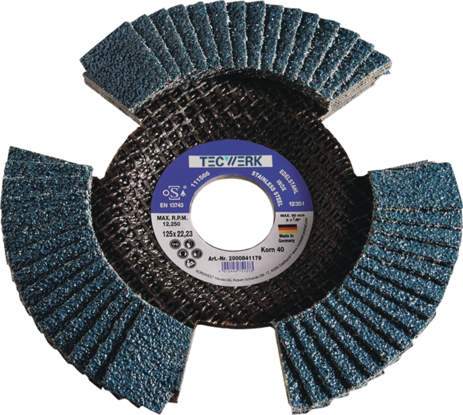 Zirkonkorund, freie Sicht auf das Werkstück, kontrollierter Materialabtrag, da die Scheibe beim Drehen wie transparent wirkt. Besonders für die Anwendung auf Stahl geeignet. Bohrung 22,23 mm Ø, max. Drehzahl 12200 min⁻¹.