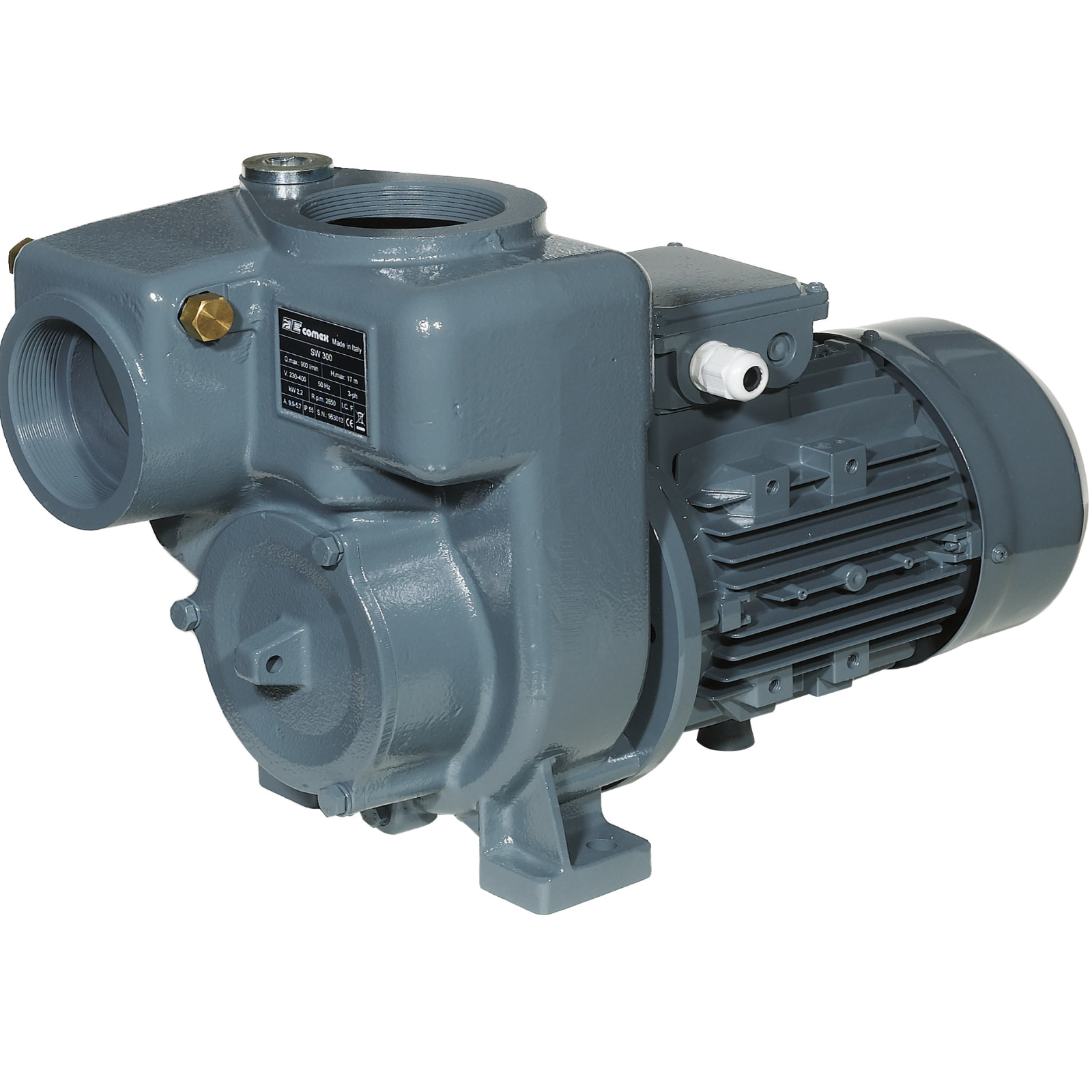 Selbstsaugende (gefüllt) Elektropumpe für Fäkalien und Schmutzwasser mit einer max. Korngröße bis 30 mm.Pumpengehäuse und Laufrad aus Grauguss, Verschleißscheibe aus rostfreien Stahl.Manometrische Saughöhe: 8 m,Max. Förderhöhe 15 m,Fördermenge max. 900 L/min = 54 m3/hMotor: 2,2 KW/3,0 PS 400 V.Anschlüsse 3 IG,Eigengewicht: 35 kg.Sehr massive Pumpe für Drainagen, am Bau oder in der Landwirtschaft, wo eine Tauchpumpe nicht einsetzbar ist.
