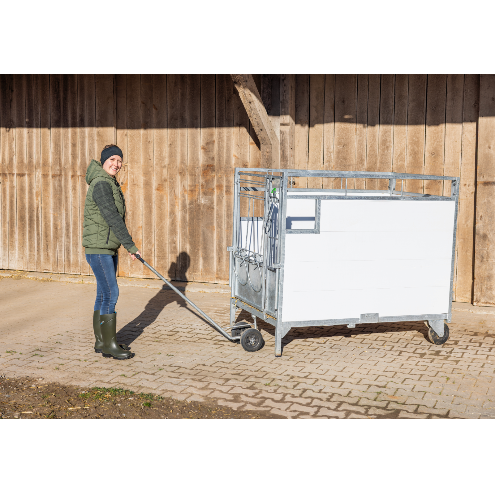 Zum einfachen Versetzen und Lenken der Kälberbox Best.Nr. 131079. Zwei Räder für bessere Manövrierbarkeit. Länge ca. 140 cm.