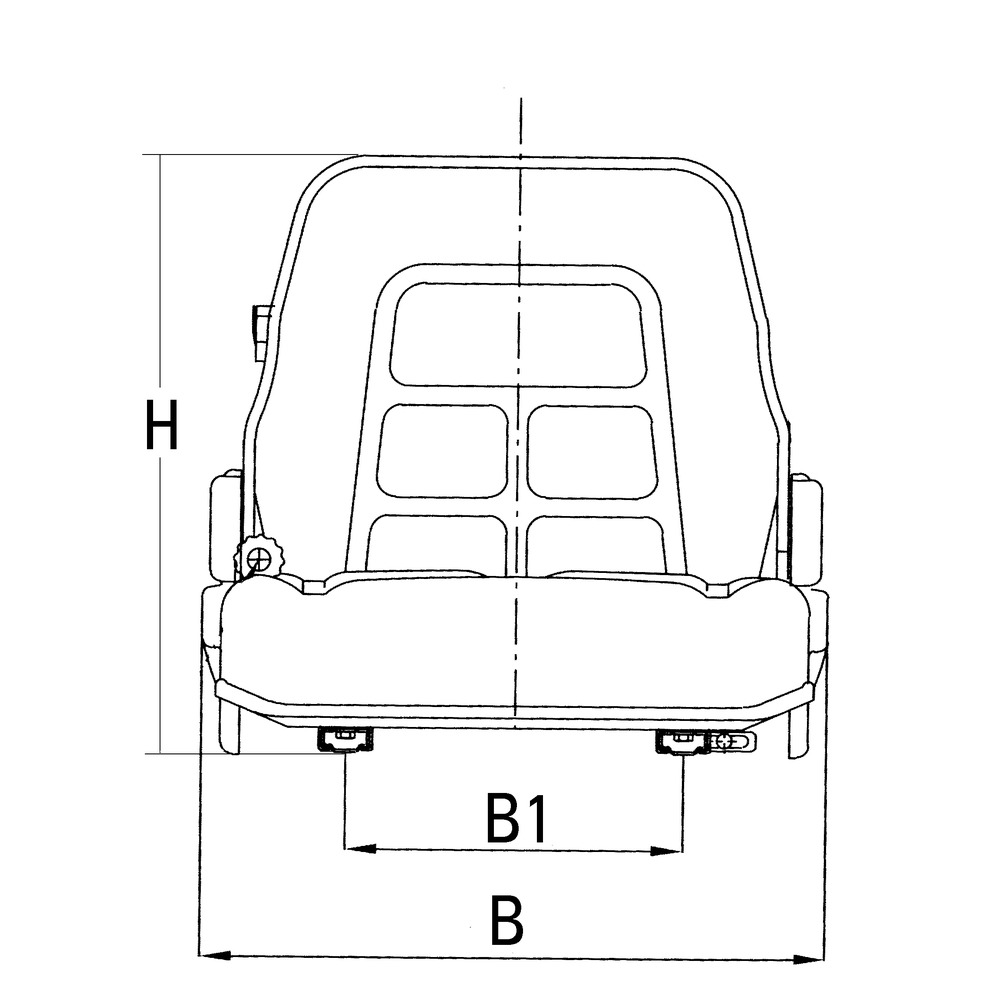 Horizontale Grundplatte, Federung 50 mm, Gewichtseinstellung 50 - 120 kg, Rückenlehnenverstellung, Längsverstellung 150 mm, Sicherheitsgurt mit Aufrollautomatik. H: 480 mm, B: 498 mm, B1: 270 mm, Tiefe der Sitzfläche: 413 mm.