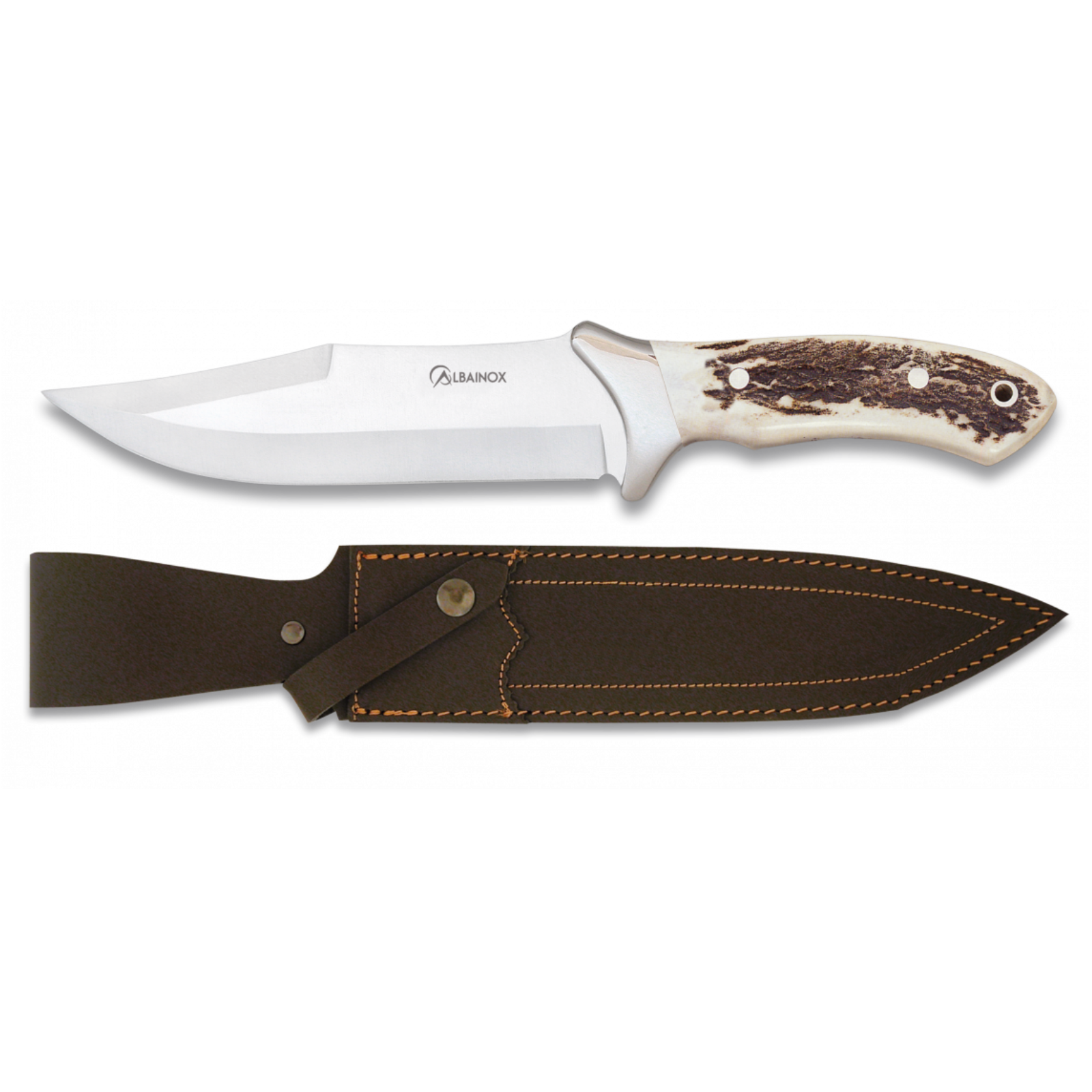 Ein wunderschönes Jagdmesser mit Hirschhorngriffschalen, liegt einfach sehr gut in der Hand mit heruntergezogenem Fingerschutz.Ein TOP Messer für den universellen Einsatz.Klingenlänge 15,6 cm , Gesamtlänge 28,6 cm, Rückenstärke 4,5 mm,wird geliefert mit einer qualitativ hochwertigen Lederscheide.