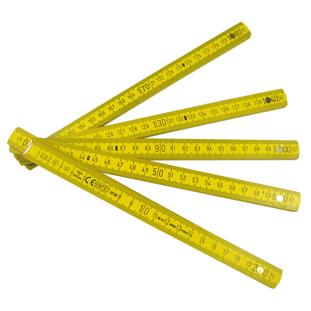 Meterstab 2 m Holz mit innenliegendem Winkelbeschlag Das Original , Winkeleindruck am 2. Glied, rastet exakt im Winkel bei 90° ein, Enden in Maßstabfarbe, Skalierung Duplex in schwarz, Genauigkeitsklasse III, mit CE-Kennzeichen. Mit verdeckten Nieten, Federn aus hochwertigem Stahl.