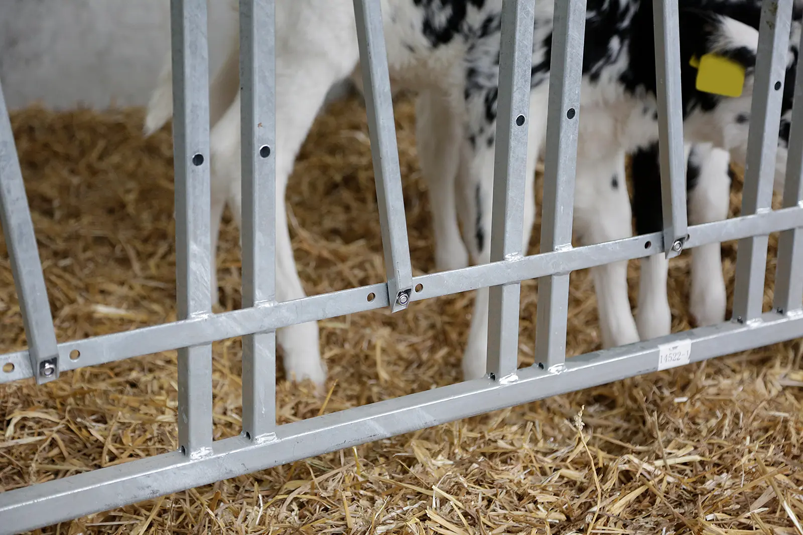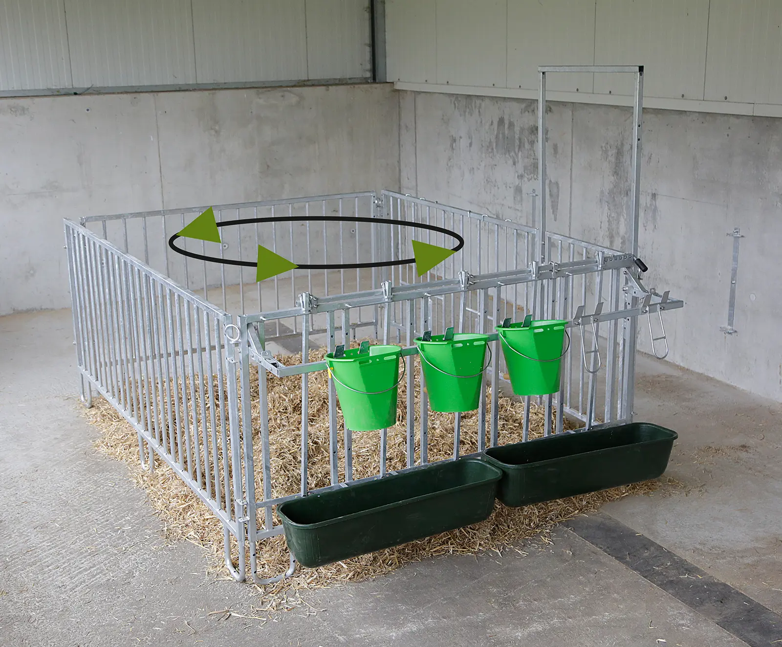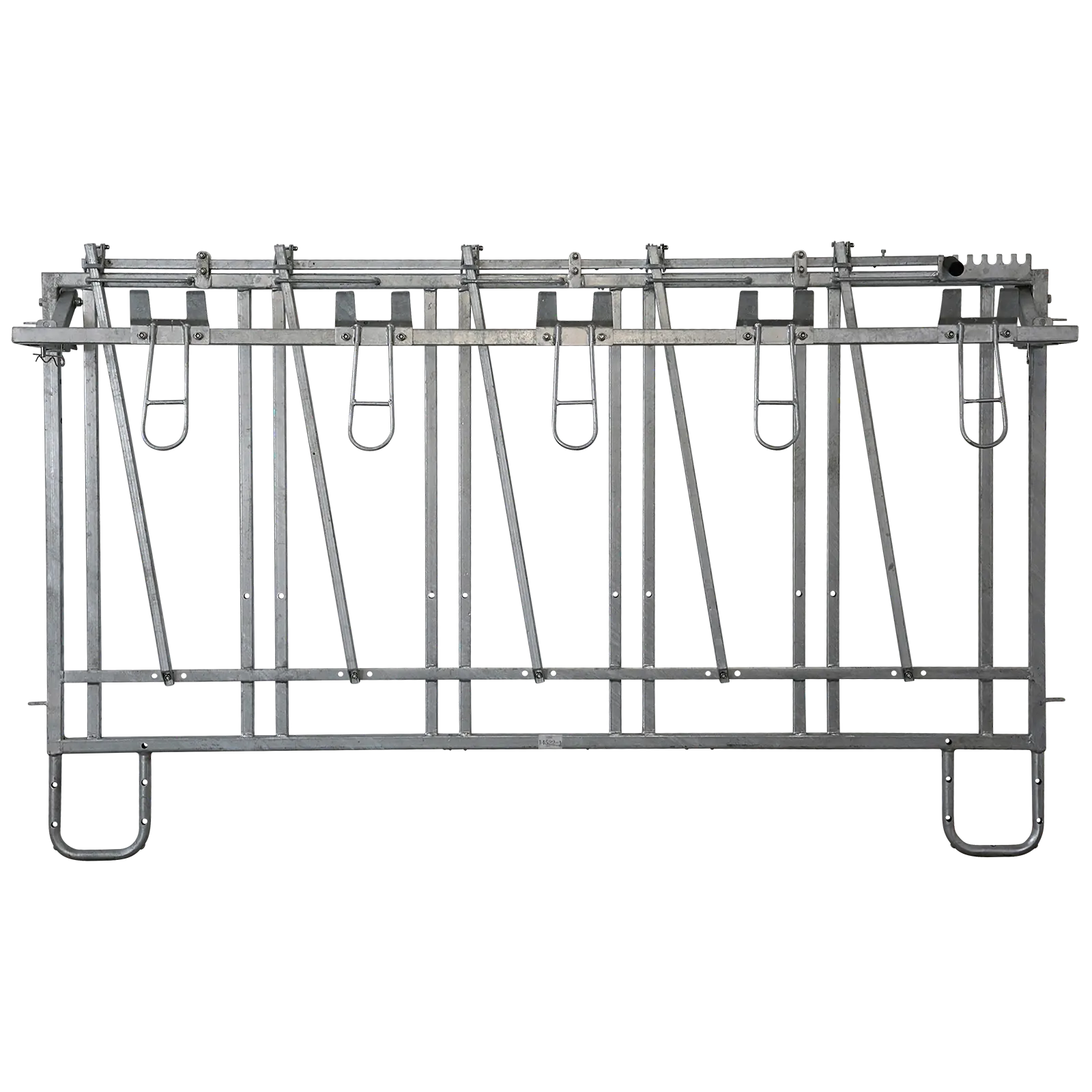Passend zur modularen Zaunaufstallung. Mit klappbarem Tränkeeimerhalter. Metall verzinkt. 5 Fressplätze. 213 x 52 x 120 cm (LxBxH)Lieferung ohne Eimer und Tröge