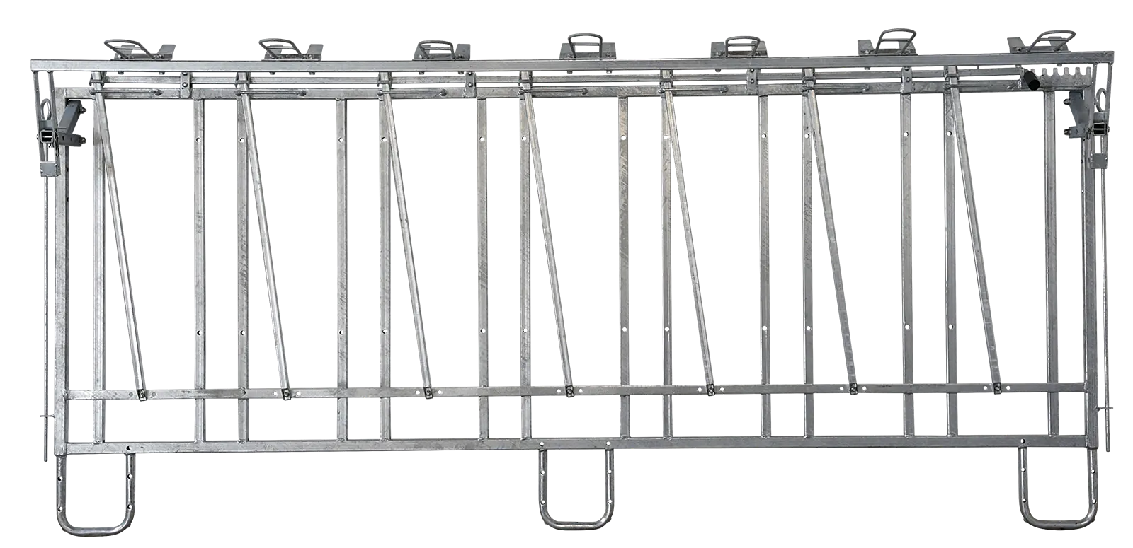 Passend zur modularen Zaunaufstallung. Metall verzinkt. Mit klappbarem Tränkeeimerhalter. 7 Fressplätze. 285 x 52 x 120 cm (LxBxH)Lieferung ohne Eimer und Tröge