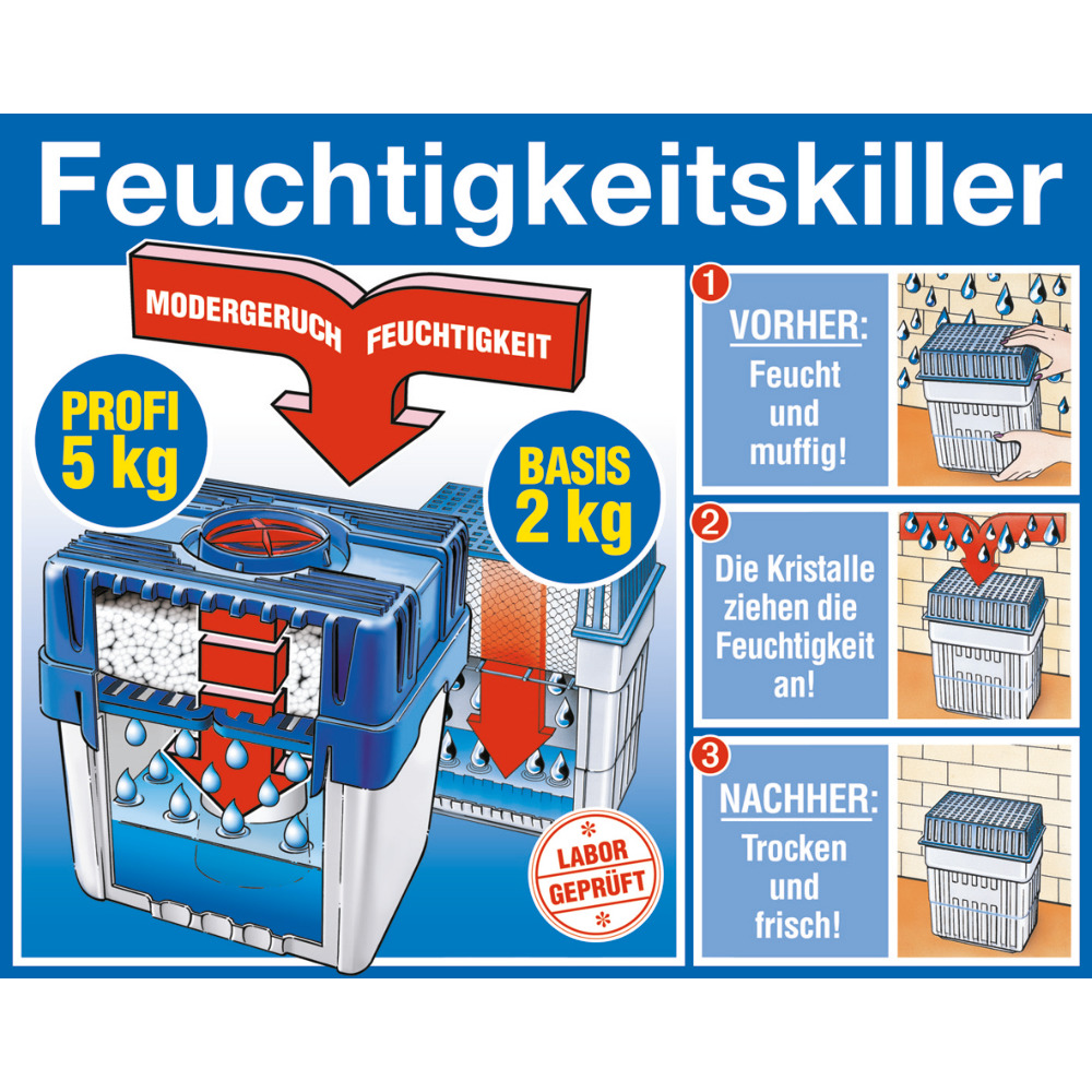 Mit Langzeitwirkung. Schützt Wände vor Feuchtigkeit, Schimmel und Modergeruch. Reicht ca. 4 - 6 Monate für Räume bis 50 m². Umweltfreundlich und laborgeprüft! 26x24x16 cm.