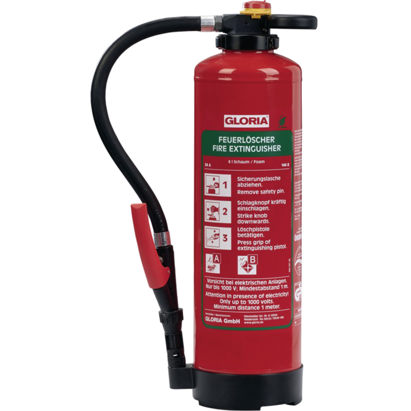Weitere technische Eigenschaften: prüfpflichtig: ja Technische Merkmale: Inhalt: 6 l, Ausstattung mit Wandhalter, Brandklasse A: 34 A, Brandklasse B: 144 B, Löschleistung LE: 10, Marke: GLORIA, Ausführung: Aufladegerät, Löschmittel: 1,5% Glorilight ECO + 35 Imprex B Länge: 565 mm, Breite: 275 mm, Höhe: 175 mm, Nettogewicht: 9.952 g