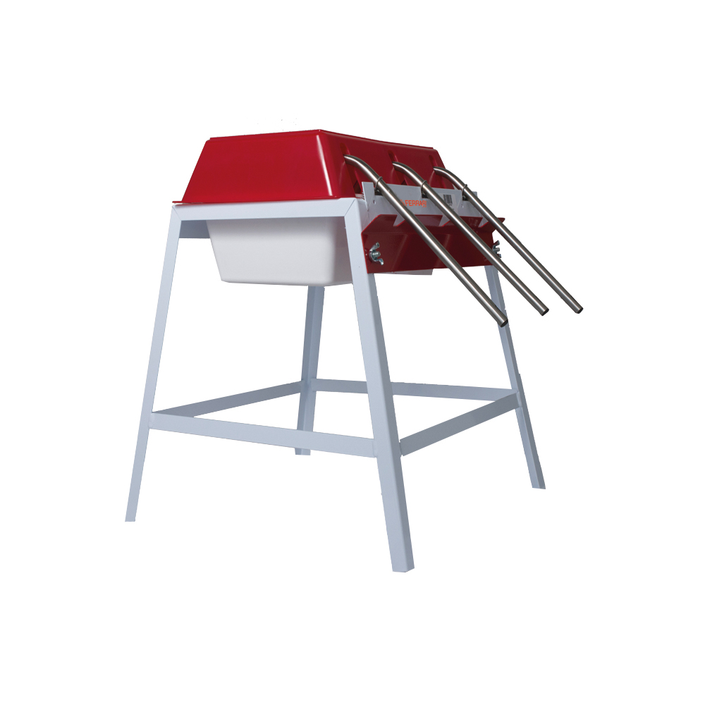 Mit Schwimmerventil das den Zulauf automatisch regelt. Behälterinhalt ca.5 Liter, Füllrohr-Ø 12 mm, Schlauchanschluss 3/4″. Tischmodell zum dosierten Abfüllen vom Most, Wein, Fruchtsäften usw. Für Sirup nicht geeignet. BxHxT: 38x50x45 cm.max. Temperatur: 40°C
