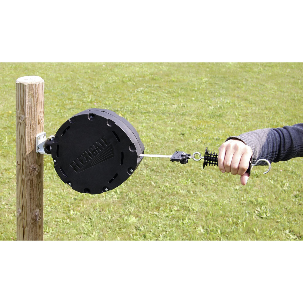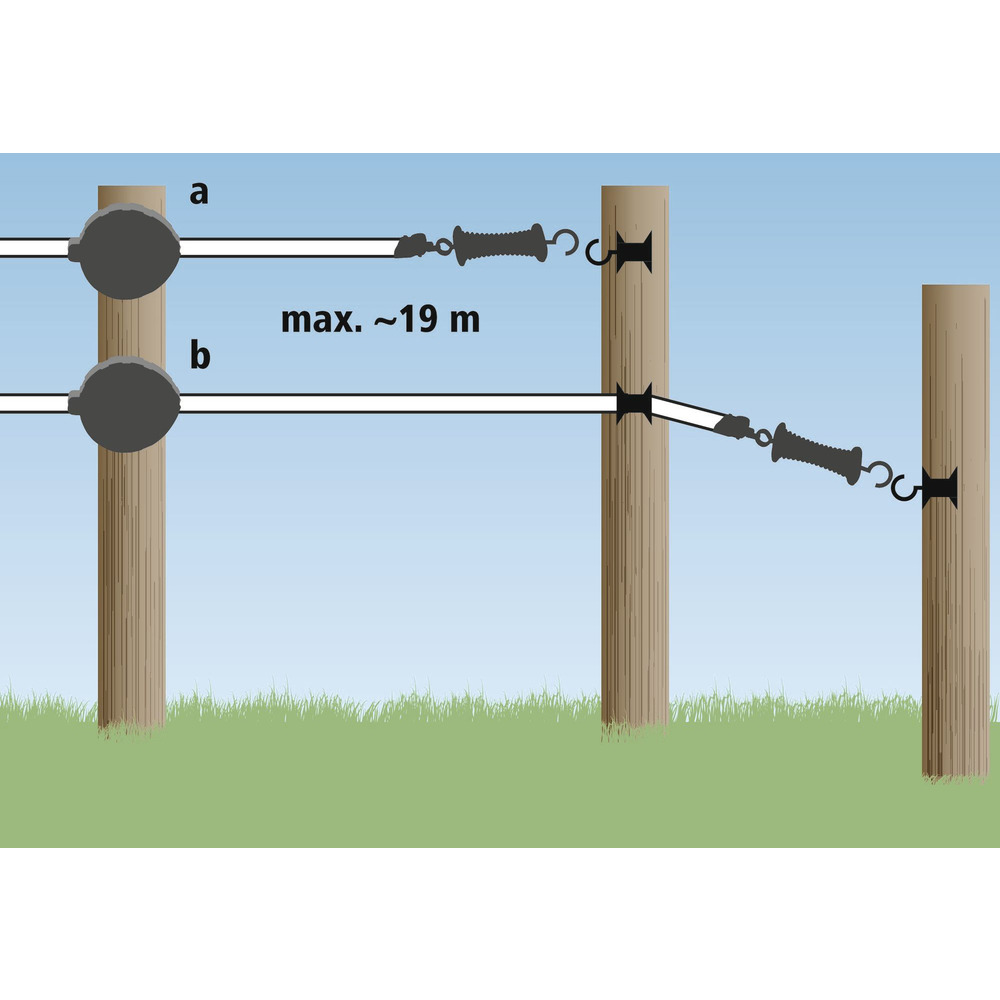 Flexibel einsetzbar, auf bis zu19 m Länge ausziehbar! Mit 20 mm Band; optimale Stromabgabe durch 9 starke Edelstahlleiter garantieren höchste Hütesicherheit am Tor. Hohe Verarbeitungsqualität, erhöhte Bruchlast durch starke Monofilfäden. Befestigungsmöglichkeit 1: mit 2 beiliegenden Holzschrauben direkt am Holzpfahl oder an einer Wand oder Befestigung 2: mit dem beiliegenden Scharnier.Achtung: Mit diesem System ist keine Stromweiterleitung möglich