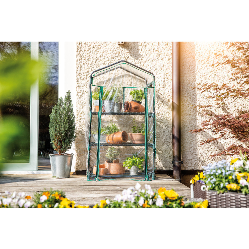 Kompaktes Foliengewächshaus zum geschützten Aufziehen Ihrer Pflanzen. Die darin erzeugten treibhausklimatischen Bedingungen sind die optimalen Voraussetzungen für ein gedeihliches Wachstum Ihrer Pflanzen. In diesem Gewächshäuschen sind Ihre Pflanzen Wind und anderen Wettereinflüssen nicht mehr schutzlos ausgeliefert. Der Stahlrohr-Rahmen und die drei Einlegeböden ergeben eine stabile Konstruktion.