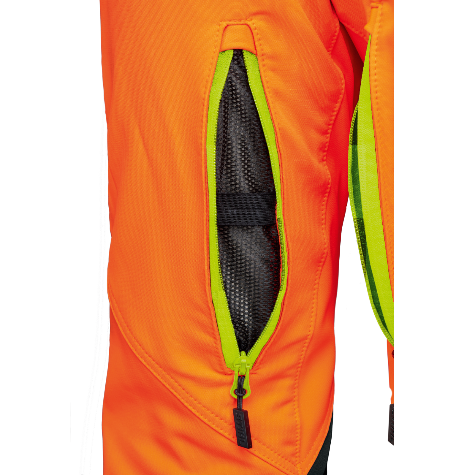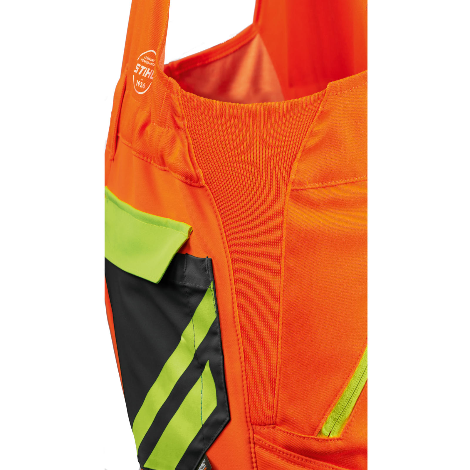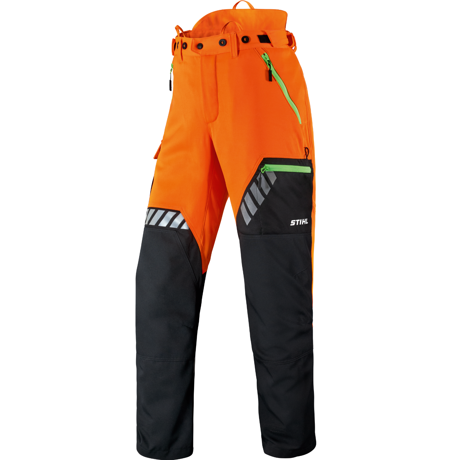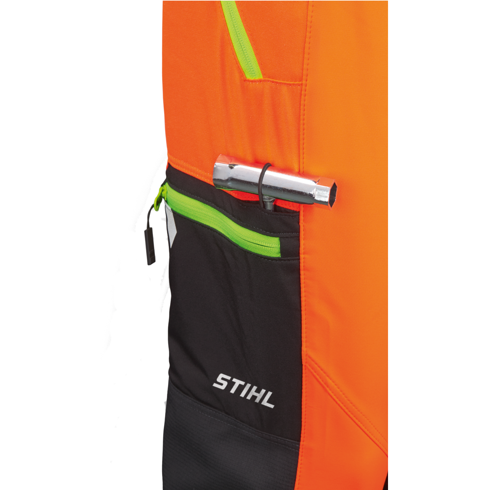 Der funktionale Materialmix aus robustem Oberstoff vorn und einem hochelastischen Stretchmaterial hinten sowie einem flexiblen ProElast Einsatz im Schrittbereich und der elastischen Verbindung vom Schnittschutz am Oberstoff der Hose bietet viel Bewegungsfreiheit. Über dem Knie und am Unterschenkel sind die Hosen mit einem robusten, wasserdichten und atmungsaktiven Dornen- und Abriebschutz versehen. Durch ein elastisches Gummiband mit Haken am Hosensaum können Sie die Hosen fest mit dem Schuh verbinden und vermeiden das Eindringen von Sägespänen und das Hochrutschen der Hose. Zum Verstauen von Gegenständen, die wichtig sind, verfügt die Hose über 2 Seitentaschen, eine Oberschenkeltasche, jeweils mit Reißverschluss, sowie eine Gesäßtasche, eine Zollstocktasche und eine Kombischlüsseltasche. An der Rückseite der Oberschenkel ist eine Lüftungsöffnungen mit Reißverschluss.