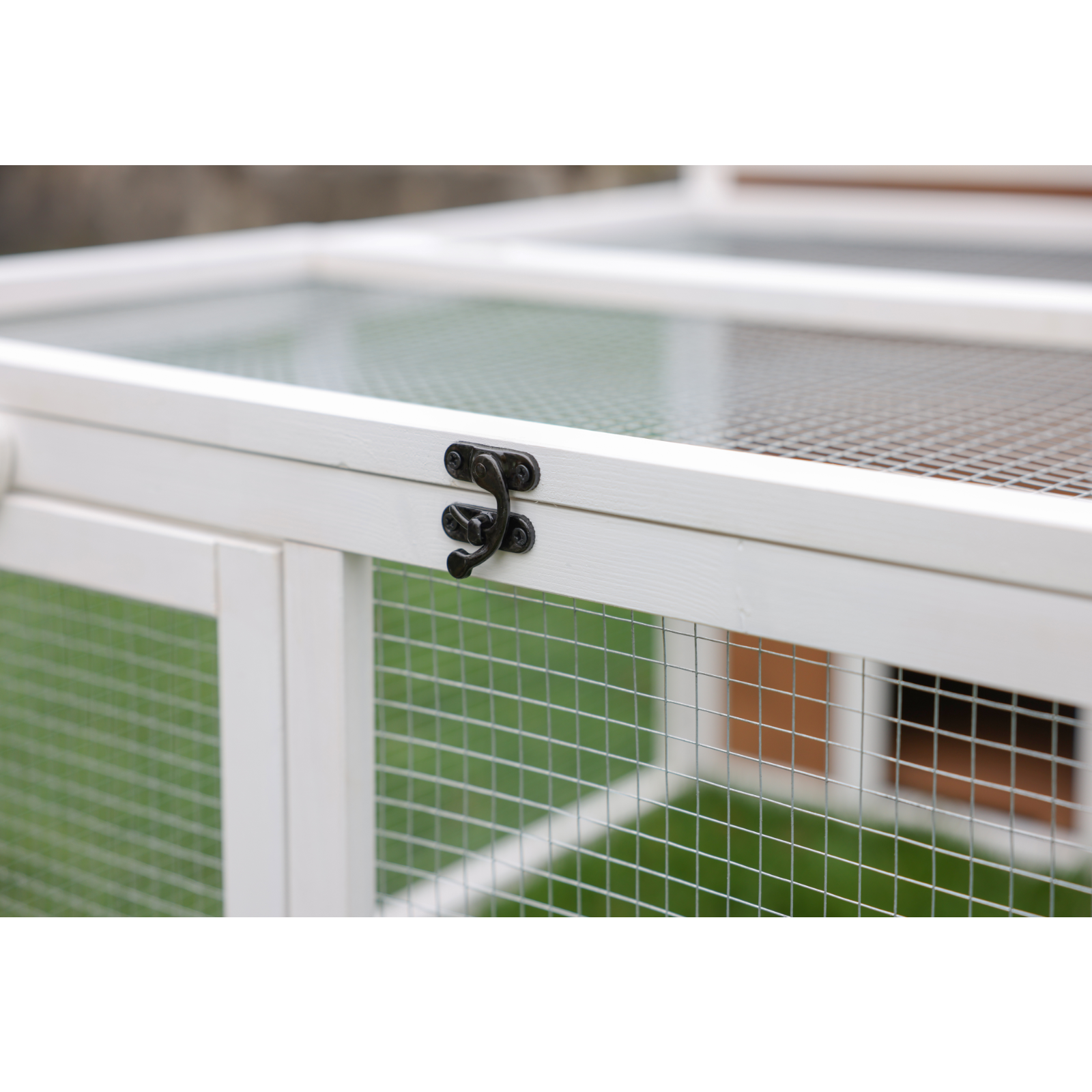 • Gitterdach des Auslaufs und Dach des Unterschlupfhaus können von oben geöffnet werden