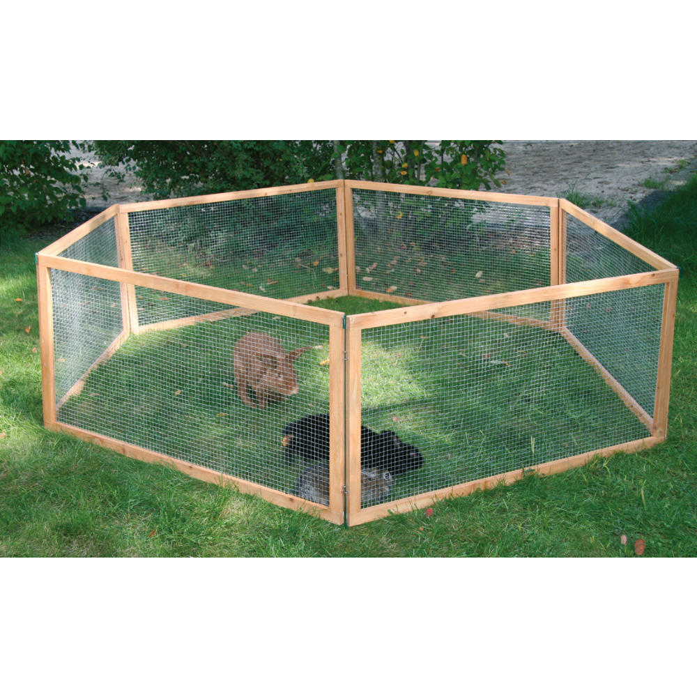 Sommerfrische im Garten! In diesem Hasengehege oder Kaninchengehege können Ihre Nager nach Herzenslust am frischen Grün knabbern, herumhoppeln und Haken schlagen. Es ist leicht versetzbar und mit ein paar Handgriffen verdoppelt sich das Nagerparadies von 1,44 m² auf 2,88 m². 6 Holzelemente mit Drahtgitter, inkl. 6 Erdspieße. Kann auch beliebig erweitert werden, mit so vielen Holzelementen wie man will! Der beste Platz für das Gehege ist unter einem Vordach an der Wetter angewandten Seite.Lieferung erfolgt zerlegt im Karton.Um die Lebensdauer des Kleintierstalles zu verlängern, sollten Sie das Holz mit geeignetem Anstrich nachbehandeln.Maße: 120 x 120 x 59 cm (L x B x H)Bitte immer gesetzliche Mindestmaße und Mindestanforderungen für die Haltung Ihrer Tiere beachten!