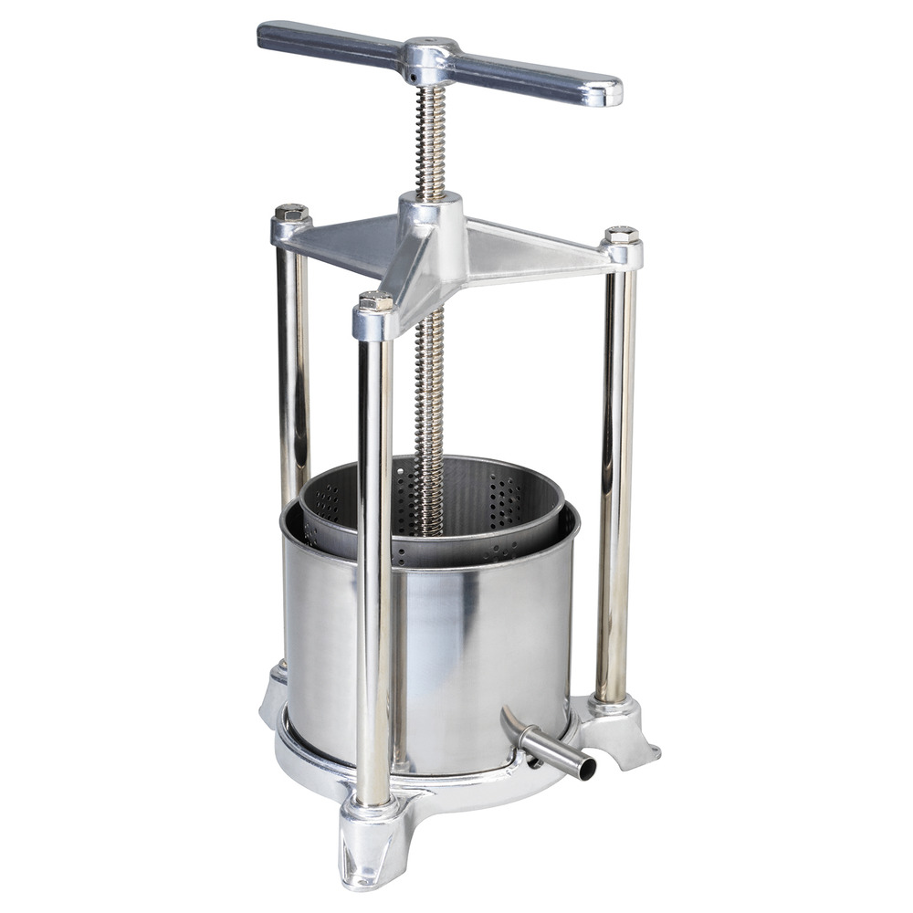 Handliche Obstpresse mit doppeltem Obstkorb aus Edelstahl in solider Ausführung. Ideal zum Pressen kleiner Mengen Beeren und Trauben.