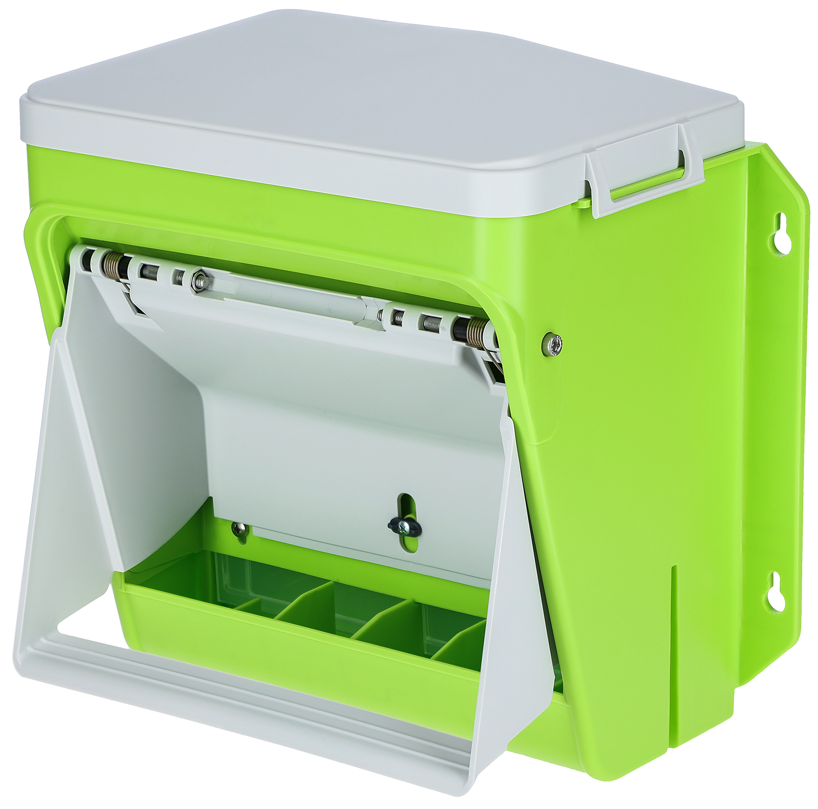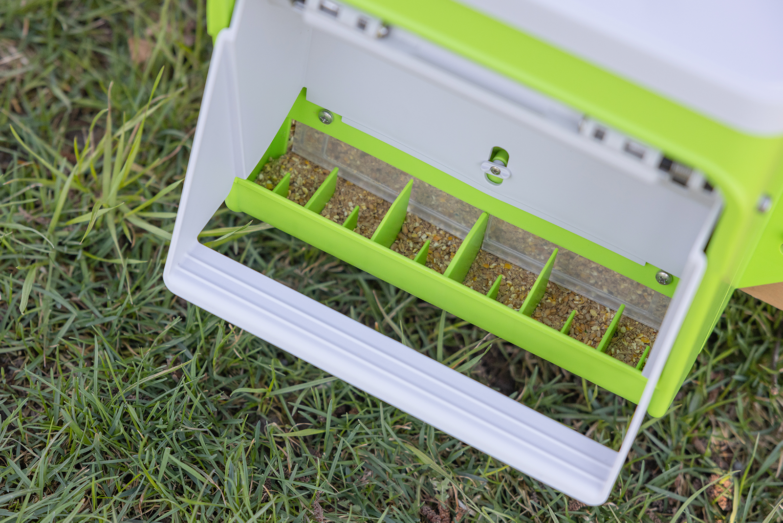 Der SmartCoop Futterautomat gewährleistet Ihren Hühnern einen stetigen Zugang zu hygienisch einwandfreiem Futter. Erst wenn ein Huhn den Trittbetätigt, öffnet sich die Klappe und ermöglicht das Fressen, bis das Huhn den Tritt wieder verlässt.Der höhergelegte Tritt kann mittels Federmechanismus ganz einfach von kleinen und großenHühnern gedrückt werden, wohin gegen Schadnagern, wie Mäusen oder Ratten, der Zugang zum Futter erheblich erschwert wird. Fassungsvermögen 7,5 kg. 36 x 27 x 34 cm (LxBxH)