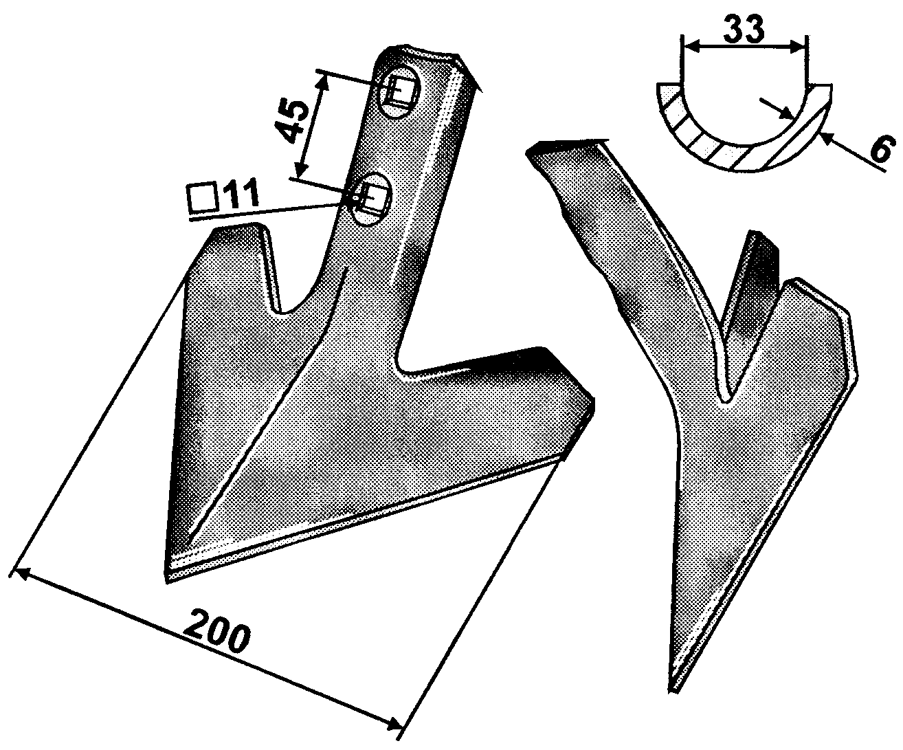 Gänsefußschar mit 200 mm Arbeitsbreite und einer Materialstärke von 6 mm. Die Bohrungen für die M10x60 Planetenschrauben haben einen Vierkant von 11 mm und der Lochabstand beträgt 45 mm.