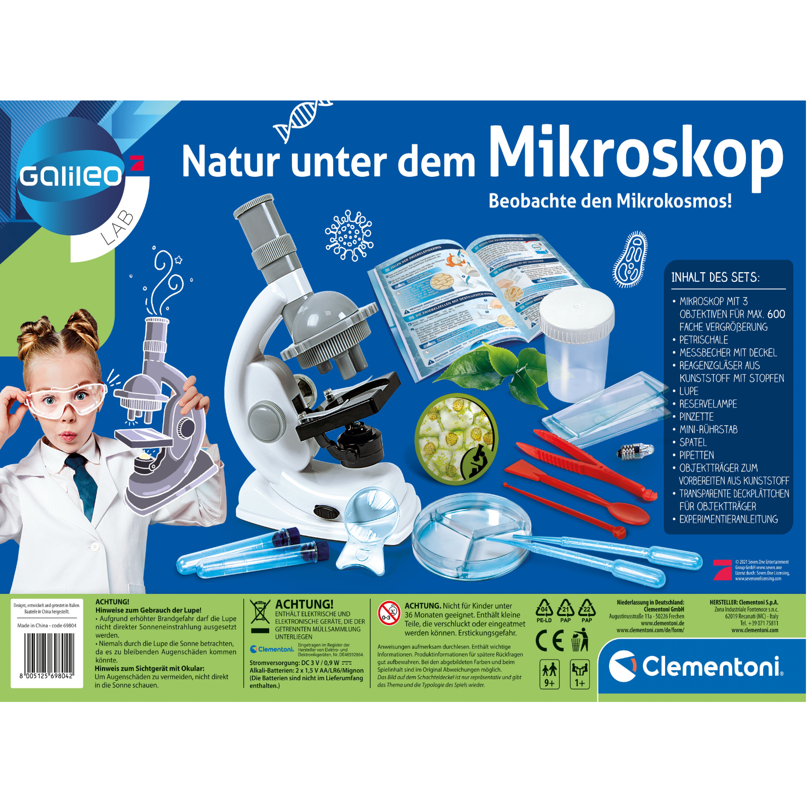 Ein phantastisches, mikrobiologisches Labor, reich an Instrumenten und Ausrüstungen, um den uns umgebenden Mikrokosmos mit Hilfe des Präzisionsmikroskops zu erforschen.Mit diesem genialen Mikroskop können Kinder in die aufregende Welt der Naturwissenschaften eintauchen. Kleinste Lebewesen, Blütenstaub und sogar Zellen werden mit der Linse bis zu 600fach vergrößert und offenbaren so ihre Geheimnisse, die mit dem freien Auge nicht sichtbar wären. Die professionellen Instrumente sorgen dafür, dass sich Kinder rasch wie echte Forscher fühlen und das Interesse an der Umwelt geweckt wird.Die kindgerechte Anleitung bietet zudem wichtige Tipps und Tricks für Einsteiger, sodass einem erfolgreichen Experimentieren und Forschen nichts mehr im Wege steht!Ein großartiges Geschenk für neugierige KinderSorgt lange für FreudeAnleitung mit 40 ExperimentenMit Pinzette, Reagenzgläsern, Glasträgern und weiterem Zubehör