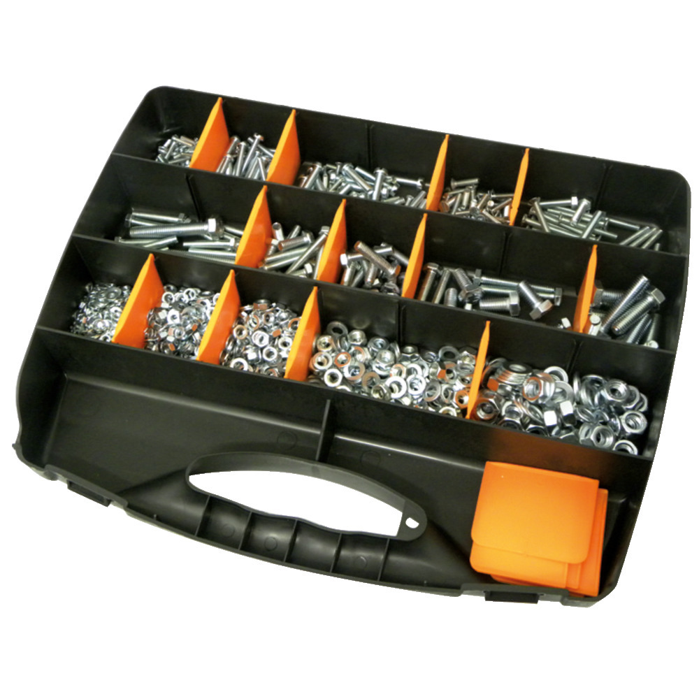 Enthält Gewindeschrauben mit verschiedenen Kopfformen (Senk-,Zylinder-, Sechskantkopf) mit Muttern, U-Scheiben, Federringe M3-M8, ca. 1500 Teile.