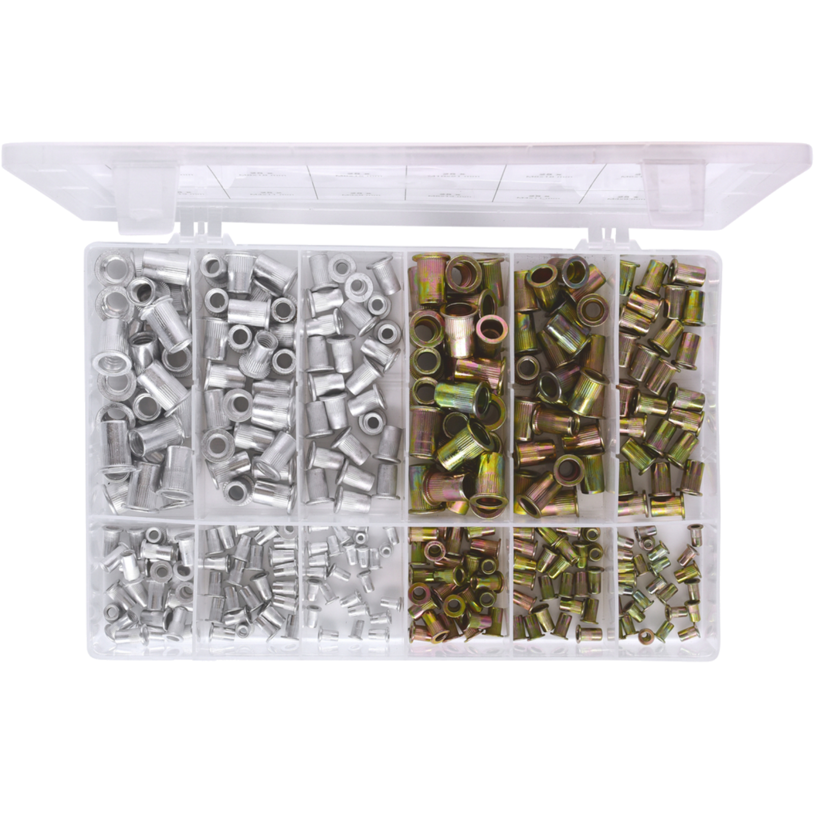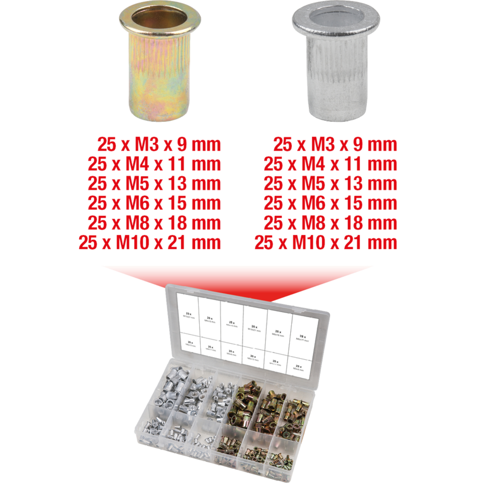 Ein 300-teiliges Sortiment mit Gewindenieten aus Stahl / AluminiumM3X9-M10x21 in stabilem Kunststoffkoffer