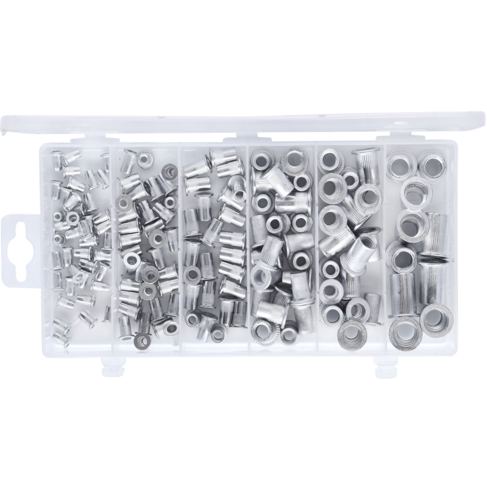 Ein 150-teiliges Sortiment mit Gewindenieten aus AluminiumM3x9-M10x21 in stabilem Kunststoffkoffer
