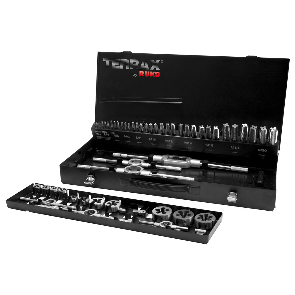 Hochwertiger 54-teiliger HSS Gewindeschneid-Satz aus dem Haus Terrax by Ruko von M3-M20 inkl. aller erforderlichen Schneideisen, Schneideisenhalter, Wendeisen, einem Schraubendreher und einer Gewindeschablone. Verpackt in praktischer Stahlblech-Aufbewahrungskassette.