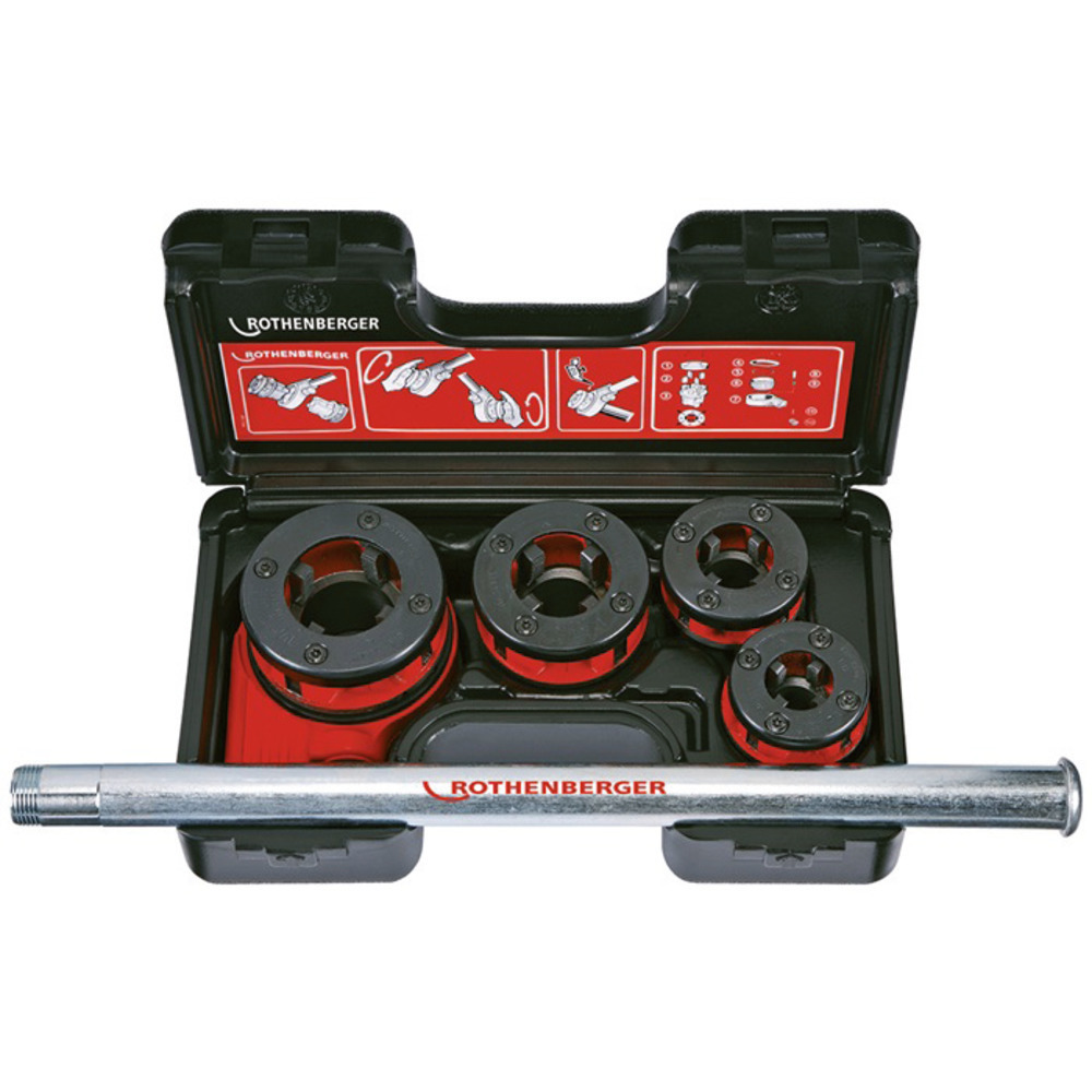 Schneidkluppenset in Original Rothenberger© Industrie Qualität. Mit den Größen ½“, ¾“, 1“, und 1 ¼“, sowie Ratschenhebel (kleine Achtkant-Aufnahme). Ausführung in BSPT R mit Ratschenhebel im Kunststoff Tragekoffer.