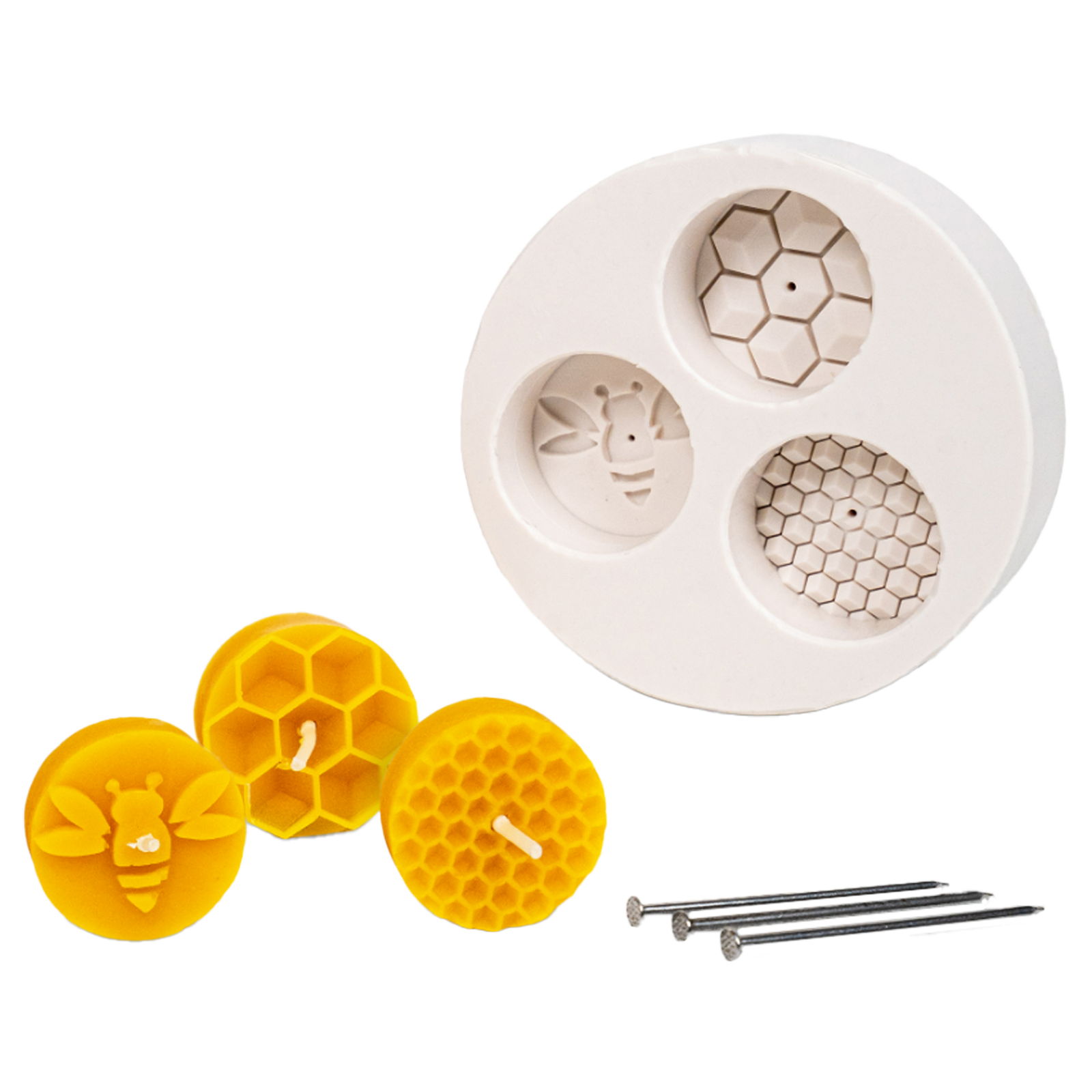 Wachsgießform aus Silikon für Bienenwachskerzen. Tolles Set mit 3 unterschiedlichen Imkermotiven und Nägel als Platzhalter für den Docht.
