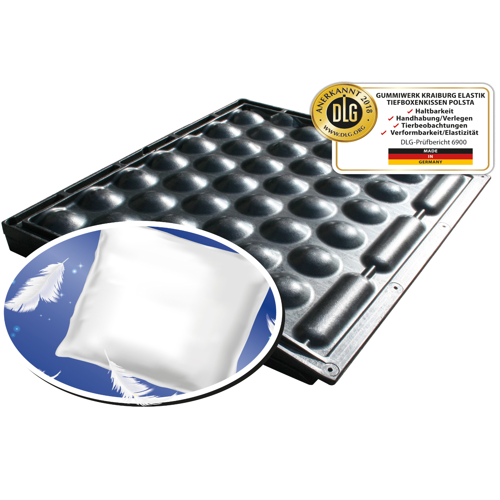 Das Tiefboxenkissen - die ideale Ergänzung für die TiefboxDas 10 cm starke Polster aus 2 Funktionsschichten ersetzt die untere, dicke Einstreuschicht im schwer zu pflegenden Kopfbereich der Tiefbox und sorgt so für eine dauerhaft stabile und bequeme Unterfütterung. Dies schont die Gelenke, erleichtert die Bewirtschaftungund spart Einstreu.Die Befestigungen sind im umlaufenden Rand versenkt. Im hinteren Bereich bleibt das Tiefboxensystem unverändert.110 x 91 x 10 cm (Breite x Länge x Stärke)