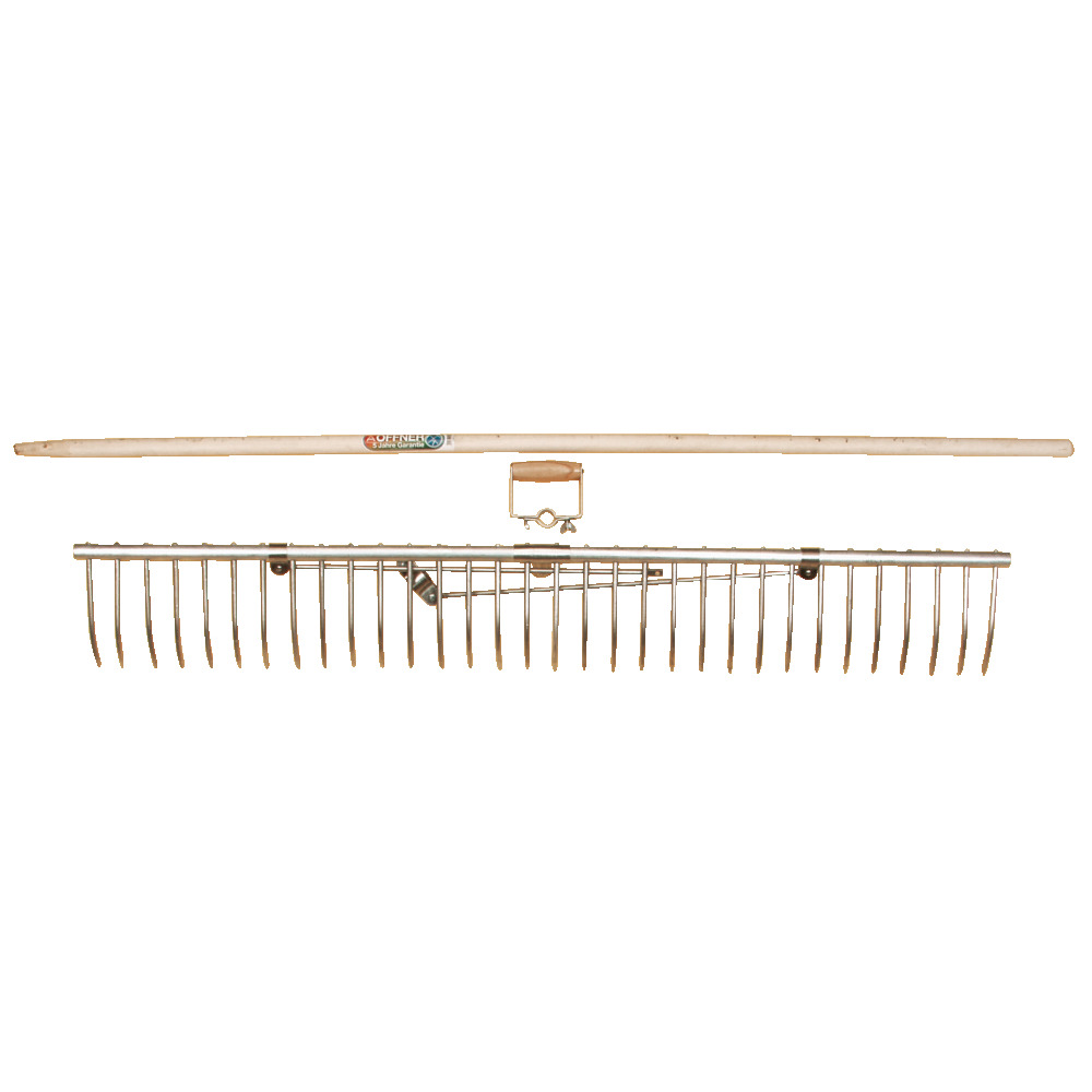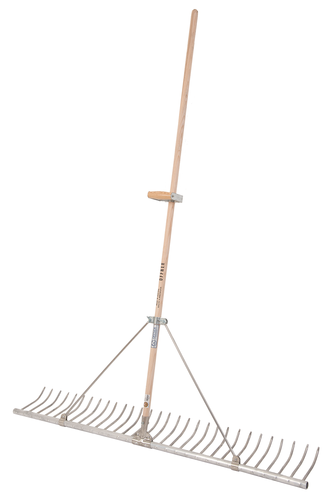 Original Offner aus Aluminium, 32 Zähne, Rechenbreite ca. 140 cm, mit D-Handgriff sowie Stiel und seitlichen Stützverstrebungen.