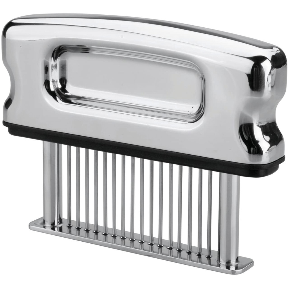 Die 16 Klingen dringen tief in die Fasern ein und machen das Fleisch besonders zart. Das Marinieren wird wesentlich vereinfacht, da die Marinade bis zu 25 % schneller in das Fleischstück eindringen kann. Das Fleisch sollte vor der Bearbeitung mit dem Handsteaker gewürzt werden! Spülmaschinengeeignet. Der Handsteaker eignet sich nicht nur für Fleisch, sondern auch für andere Lebensmittel wie Gemüse oder Tofu. 12 x 2 cm.
