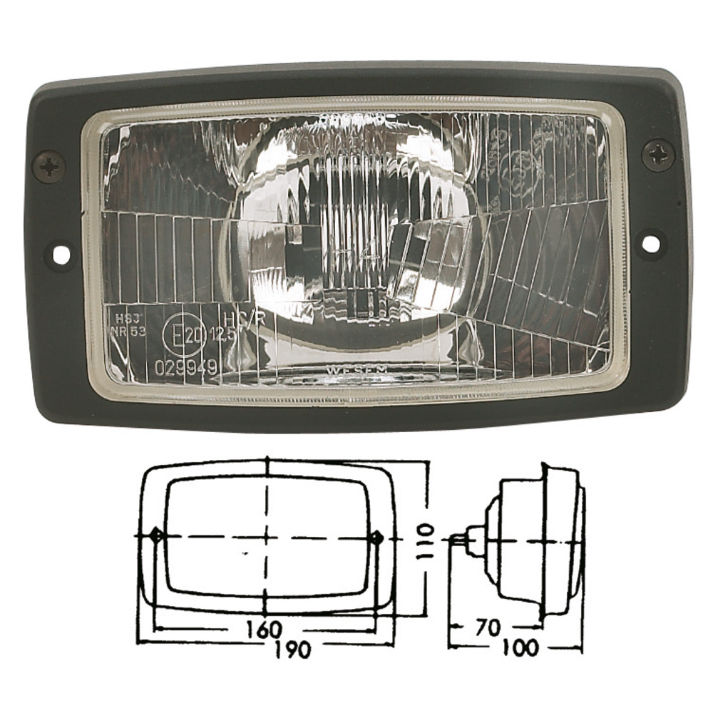 12 V, H4 mit Begrenzungslicht. Passend teilweise auch für Steyr Serie 80, 900 und Lindner ab `99. Asymetrisches Licht, Glasrahmen aus schwarzem Kunststoff, Reflektor und Streuscheibe zusammen verklebt, Streuscheibe Einstellwinkel +/- 4°, Maße: 182x102 mm, Schraubabstand: 160 mm, Einbauöffnung: 145x90 mm