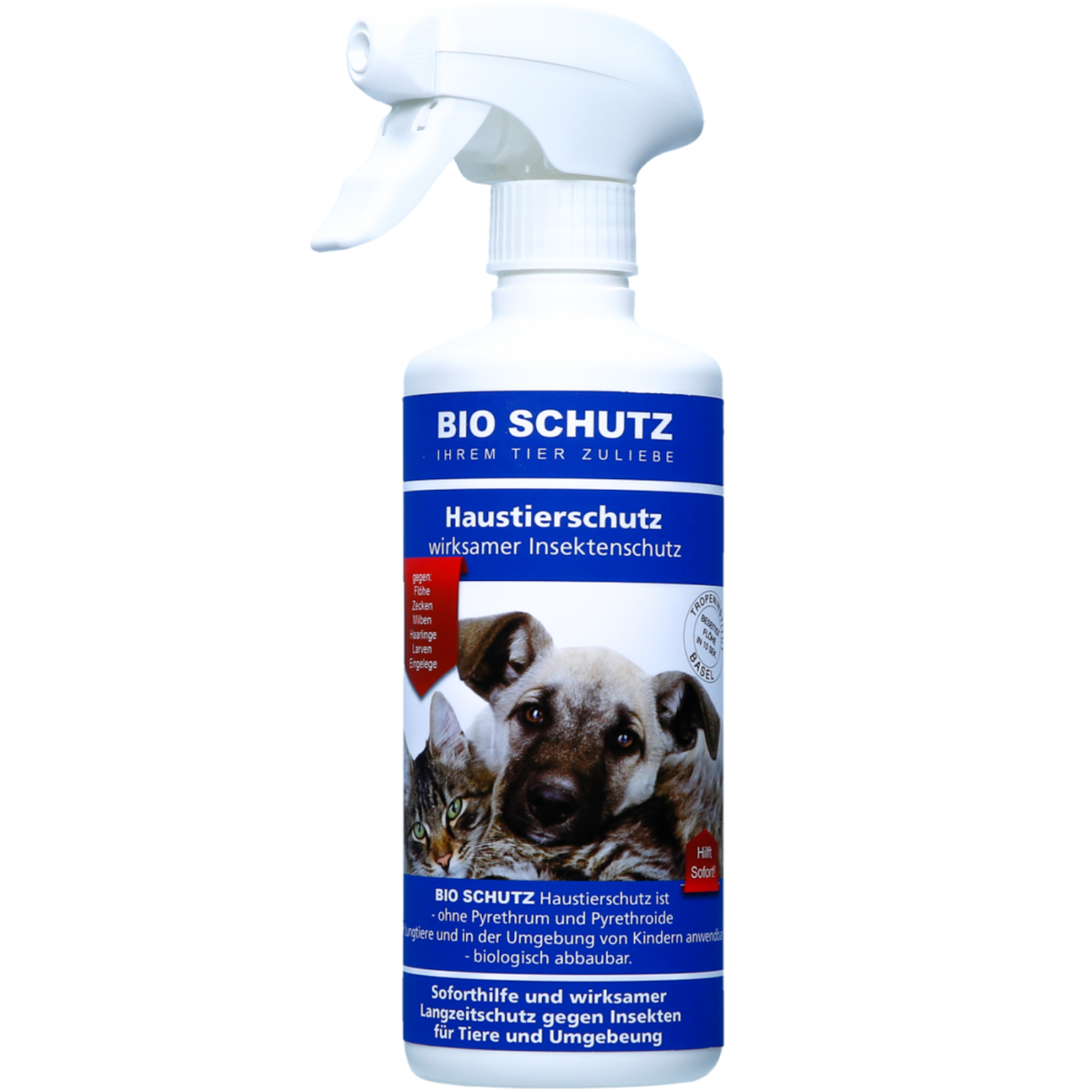 Gegen Flöhe, Zecken, Milben, Haarlinge. Beseitigt auch Larven und Eigelege. Flasche 400 mlZur Anwendung am Tier und in deren Umgebung. z.B. auf Liegeflächen, Sofas, Betten etc.• beseitigt binnen Sekunden jegliches Ungeziefer, auch Larven und Eigelege und schützt vor Neubefall.• Damit ideal bei akutem Parasitenbefall bei allen Haustieren und auf deren Aufenthaltsplätzen.• geruchsneutral• Wirkt auch gegen andere Insekten wie z.B. Ameisen, Küchenschaben und Lebensmittelmotten.BAUA-Registrierungsnr. N-57919Natürlicher Wirkstoff GerianolGeraniol ist ein naturbasierender Stoff, der Bestandteil zahlreicher Pflanzen und Kräuter ist. Er findet sich u.a. in Geranien, Rosen, im Koriander, im Lorbeer,im Thymian sowie im Currykraut. Eingesetzt wird Geraniol auch in der Parfümindustrie, für aromatherapeutische Anwendungen und in Lebensmitteln. AlsWirkstoff zur Insektenbekämpfung hat Geraniol vor allem den Vorteil, dass es sowohl hervorragend als Repellent (wehrt ab, vertreibt) wie auch effektiv alsabtötendes Insektizid wirken kann. Damit ergibt sich eine breite Palette an Produkten, die je nach Ausbringung und Dosierung zur Prophylaxe oder akutenAnwendung, vor allem gegen Flöhe und Zecken, ideal sind. Der größte Vorteil ist allerdings, dass Geraniol sich vor allem von üblichen toxischen Insektizidenunterscheidet. Seit Jahrzehnten wurden hauptsächlich Gifte gegen Insekten eingesetzt. Vor allem Nervengifte belasten das Immunsystem von Menschund Tier, sowie die Umwelt. Geraniol ist kein Nervengift. Stattdessen wird lediglich das Chitin der Insekten angegriffen, was zu ihrem Absterben führt.Mensch und Haustier haben kein Chitin, bleiben von diesem Effekt unberührt. Die gewünschte Wirkung wird bereits bei geringer Dosierung erreicht, so dassin Bio Schutz Produkten selbst der typische Geruch von Geraniol kaum wahrnehmbar ist.BIO SCHUTZ Haustierschutz vorsichtig verwenden. Vor Gebrauch stets Kennzeichnung und Produktinformation lesen.