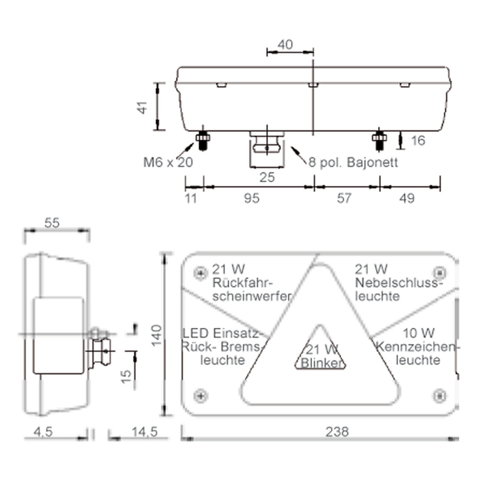 Rücklicht und Bremslicht mit LED, 238x140x55 mm, mit 5-poligem Bajonett-Anschluss, 12 Volt.