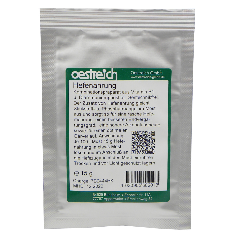 Vitamin B1 unterstützt und fördert die Hefevermehrung, der Zusatz von Diammoniumphosphat gleicht Stickstoff- u. Phosphatmangel im Most aus und sorgt so für eine rasche Hefemehrung, einen besseren Endvergärungsgrad, eine höhere Alkoholausbeute sowie für einen optimalen Gärverlauf.Gentechnikfrei, zur Herstellung von Bioprodukten geeignetAnwendung: Je 100 L Most 15 g Hefenahrung in etwas Most lösen und im Anschluß an die Hefezugabe in den Most einrühren. Trocken und vor Licht geschützt lagern.