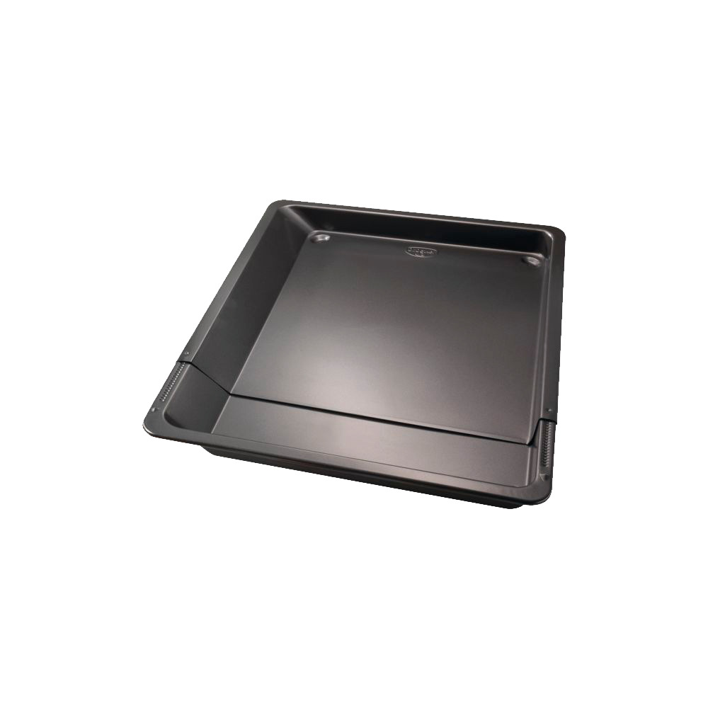 Praktisches Herdbackblech verstellbar aus Stahlblech mit Antihaft-Beschichtung. Beste Backergebnisse durch ausgezeichnete Wärmeleitung, leichte Reinigung mit der Hand, temperaturbeständig bis 230°C, 5 Jahre Garantie, Made in Germany, schwarz. Stufenlos verstellbar von 33x37-52x3cm.