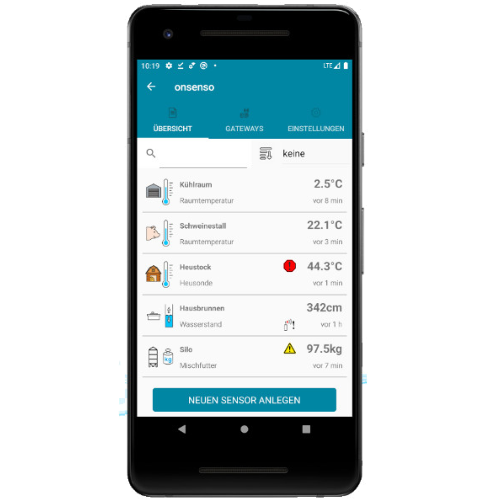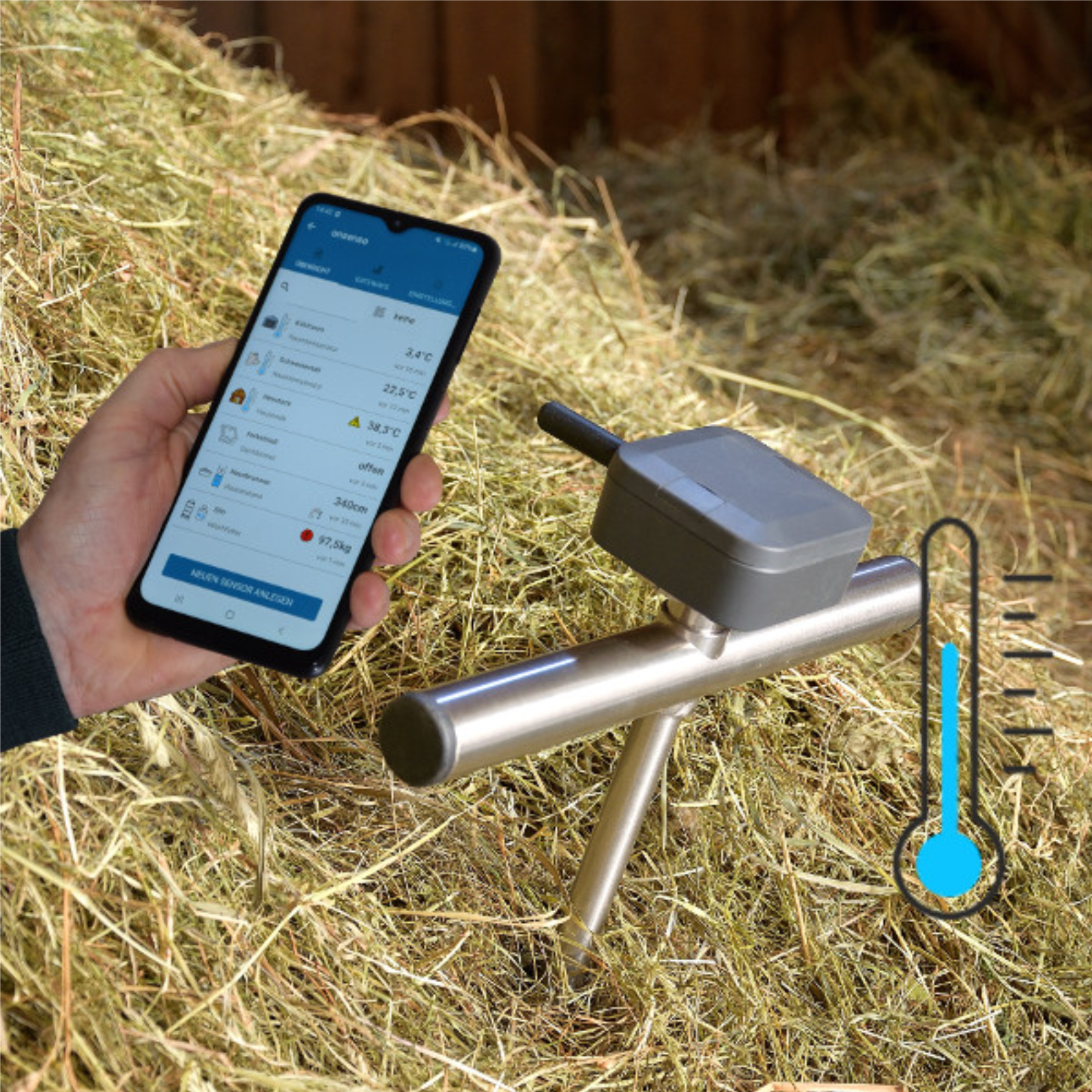 Heusonde / Heustocksonde für die Online Überwachung der Heutemperatur im HeustockVorbeugunggegen Brandgefahr und SelbstentzündungKontrolle der Temperatur und Alarmierung mit der onsenso Handy-AppLoRa FunktechnikProduktbeschreibung:Zuverlässige und bequeme Temperaturüberwachung Ihres HeustocksDieTemperatur im Inneren des Heulagers wird mit einer oder mehreren onsenso Temperatursonden gemessen.Die Messwerte bekommen Sie direkt aufIhr Handy.Bei Überschreitunge der eingestellten Grenzwerte werden Sieautomatisch alarmiert.Lora Gateway als Basisstation für Ihre onsenso SensorenDer onsenso Gateway empfängt die Heutemperatur von den Sensoren und sendet die Daten über Internet an den Server.Einfache InbetriebnahmeDerSensor wird in der onsenso Weboberfläche mit seinen Daten eingetragen. Noch einfacher ist es, mit der onsenso App den Sensor durch Scannen des QR-Codes anzulegen.Sofort nach Einlegen der Batterie ist der Sensor in Betrieb. Der Gateway wird nur an das Internet und das Stromnetz angeschlossen und ist sofort betriebsbereit, eine Konfiguration ist nicht erforderlich.Individuelles, zweistufiges AlarmierungssystemSieentscheiden selbst, bei welchen Temperaturen Sie in eine Warnung oder einen Alarm entweder per E-Mail oder per Pushnachricht auf Ihr Mobiltelefon bekommen.Auch andere Personen können in die Alarmierung mit einbezogen werden.Sicheres DatenmanagementDie Datenübertragung erfolgt in verschlüsselter Form ausschließlich über Ihren eigenen onsenso Gateway direkt zum onsenso Server.Nur Sie (und von Ihnen ermächtigte Personen) können mit Ihren Zugangsdaten Ihre Messergebnisse sehen und auswerten.Basis für das Onsenso FernüberwachungssystemMitdiesem Set haben Sie alle Komponenten für den Einstieg in die Onsenso Fernüberwachung, auch den Gateway und die erste Jahreslizenz.Sie könnenjederzeit weitere Sensoren oder Messgeräte ergänzen und Ihr System erweitern.Lieferumfang: