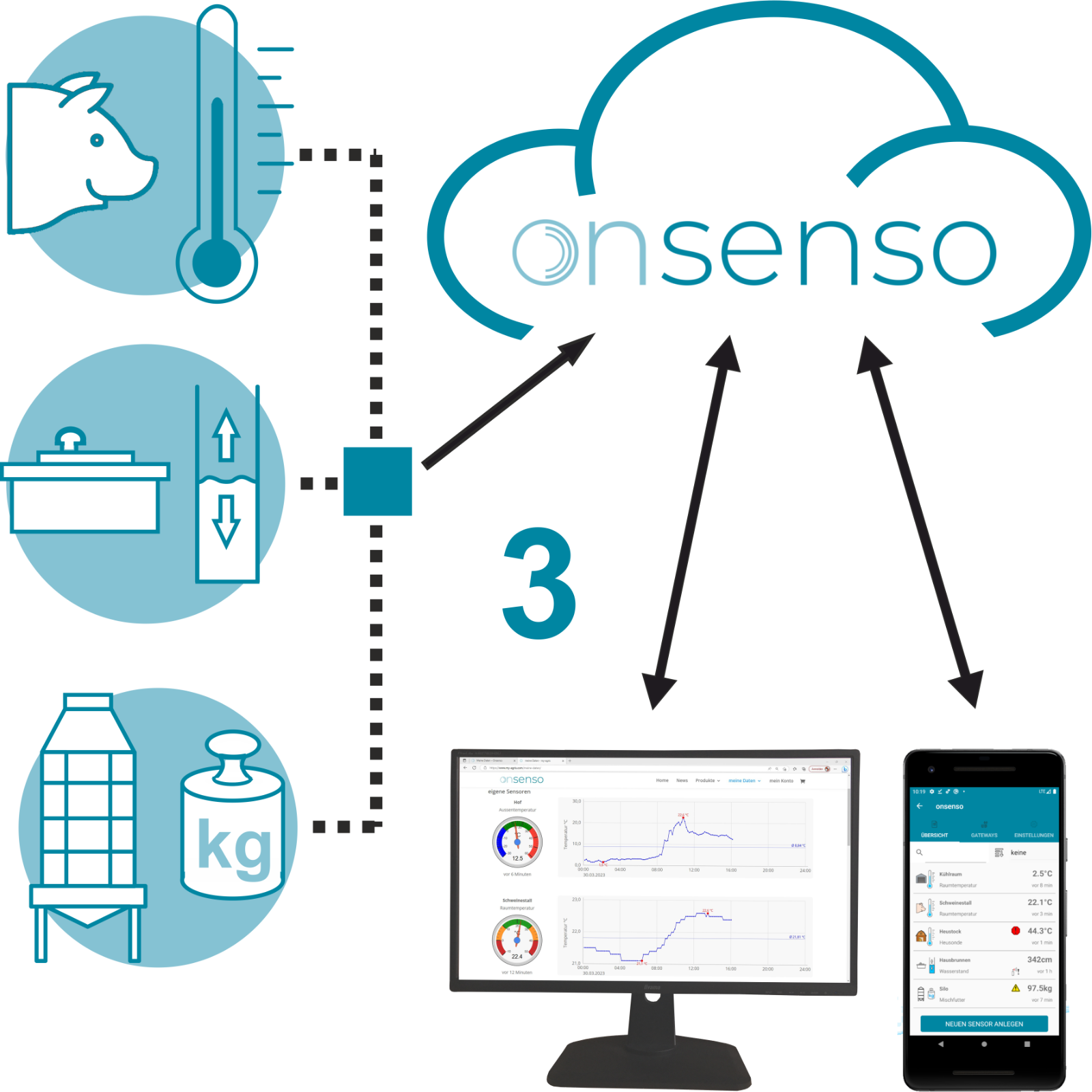 Temperatursonde:• Zweiteilige Sonde aus Edelstahl• Nutzbare Lanzenlänge 177 cm• Lanzendurchmesser 16 mm• Abschraubbarer Griff• Temperatursensor in der Lanzenspitze• Elektronik im ABS Kunststoffgehäuse• Schutzklasse Gehäuse IP67• Gehäusemaße 75 x 75 x 35 mm (L x B x H)• Sensor in der Lanzenspitze• Sensor Messbereich -55 bis +125 °C• Genauigkeit +/- 1 °C• Schutzklasse Sensor IP68• Datenübertragung über LoRa Funktechnik• Funkfrequenz 868 MHz• AES-128 Verschlüsselung• Messintervall / Sendeintervall 10 Minuten• Reichweite bis 1.000 m• Stromversorgung über Lithium-Batterie 1 x LS14500 3,6 V• Batterielebensdauer ca. 3 JahreGateway:• ABS Kunststoffgehäuse• Gehäusemaße 101 x 74 x 43 mm (L x B x H)• LAN Anschluss mit Netzwerkkabel• Datenübertragung vom Sensor über LoRa Funktechnik• Funkfrequenz 868 MHz• AES-128 Verschlüsselung• Sendeintervall an den Server 10 Minuten, kritische Werte sofort• Spannungsversorgung über 230 V NetzteilOnsenso Server:• Speicherung der Messwerte• Zugriff auf Echtdaten nur für Kunden• Serverstandort ÖsterreichOnsenso Webportal:• Benutzerverwaltung• Anlegen der Gateways und Sensoren• Visualisierung der Messwerte• Festlegen der AlarmierungenOnsenso Handy App:• Anlegen der Gateways und Sensoren• Visualisierung der Messwerte• Festlegen der Alarmierungen• Alarmierung über Push NachrichtenVoraussetzung:stationäres oder mobiles Internetmodem vom Handybetreiber mit Netzwerkabelanschluss für den GatewayACHTUNG: Für den Betrieb ist eine Lizenz erforderlich. Im Kaufpreis ist eine 3-Jahres-Lizenz inkludiert. (Danach fallen weitere Kosten an!)