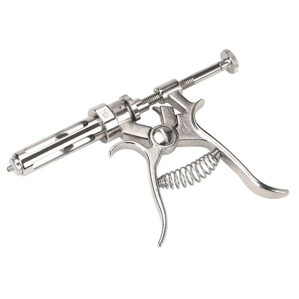 Messingverchromte und polierte Ausführung, Duritkolben-Fensterhülse graduiert, die Dosierung erfolgt mittels einer Teilscheibe, bestens geeignet für Massenimpfungen. Mit spannbarem Kolben, mit Gewinde-Ansatz. Verwendung für 30 ml. Dosierung 0,5 - 2,5 ml.