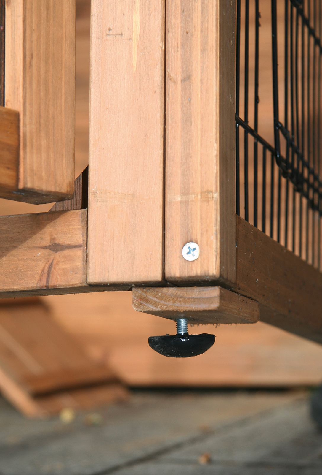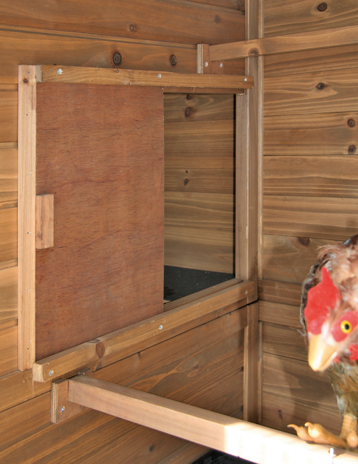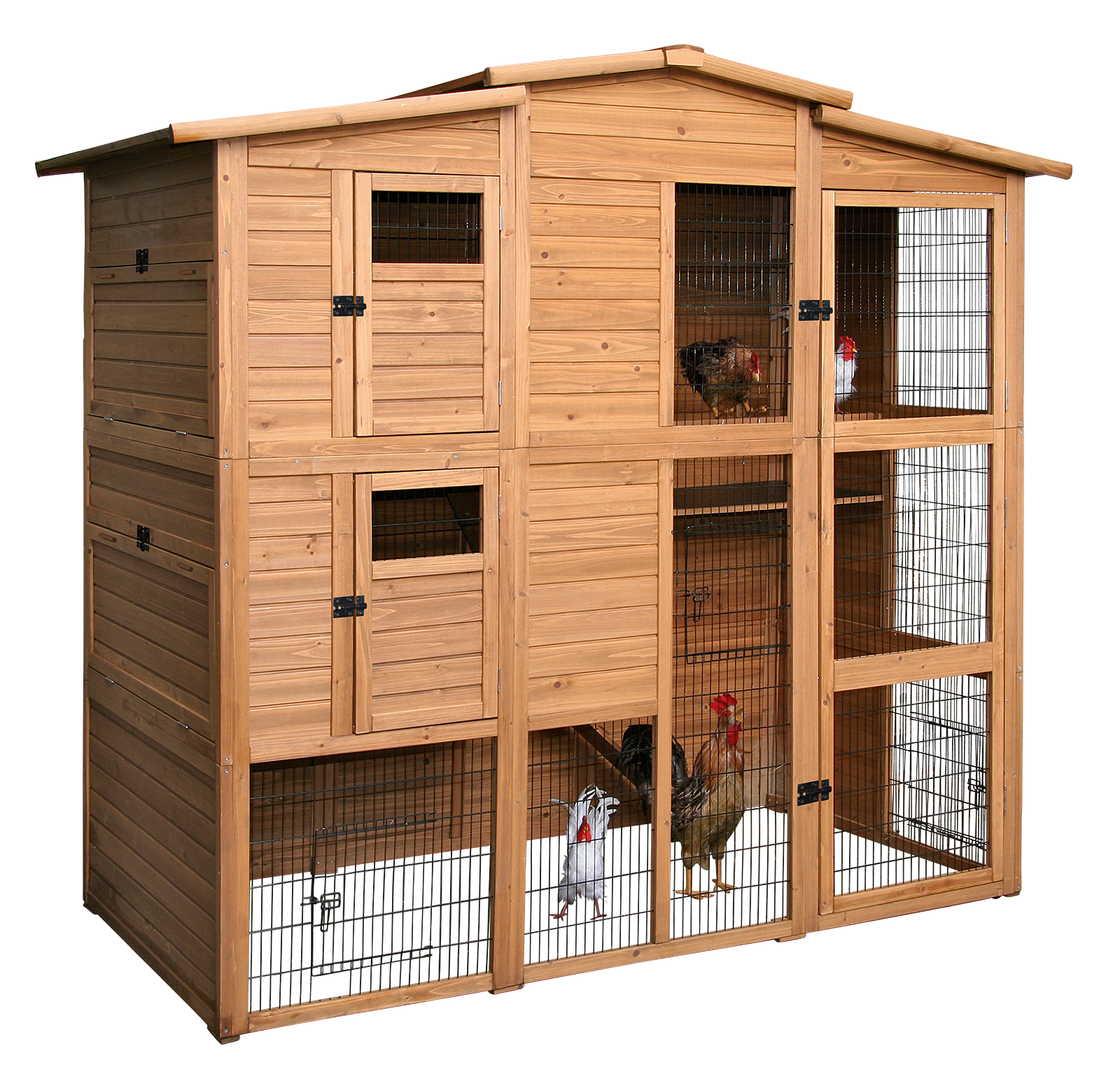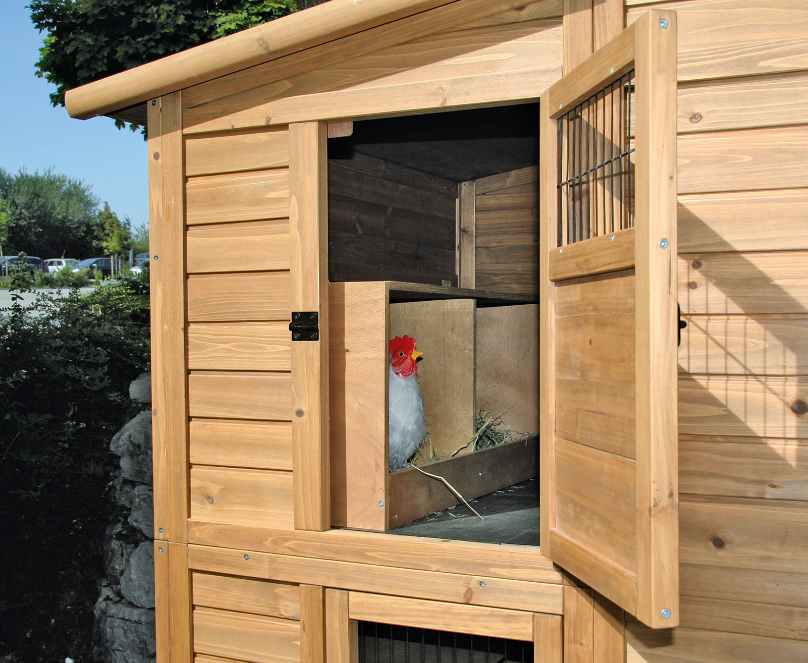 Zubehör:3 Legenester pro Etage, mit Zugriffsmöglichkeit von außen, Ausgehrampe,2 Holzsitzstangen im Gehege mit kunststoffbeschichtetem Kotbrett