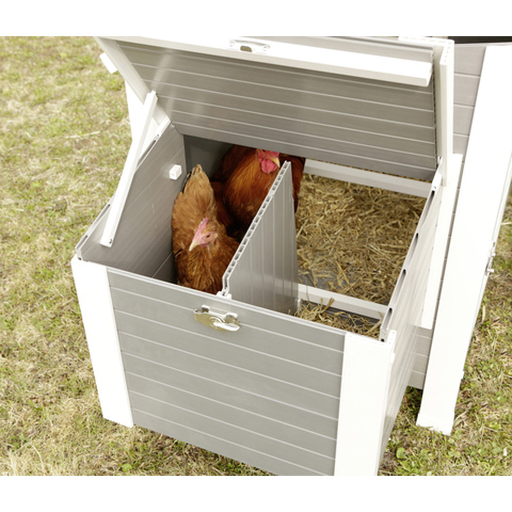 Weitere Vorteile: 2 Türen getrennt zu öffnen, inkl. 2 Legenestern und zwei Sitzstangen, mit Schiebefenster für variable Luftzirkulation, verlängerte Füße für bessere Bodenbelüftung, aufklappbares Dach mit Fixierung, Lieferung erfolgt zerlegt im Karton, inkl. Aufbauanleitung, einfach Montage durch vorgebohrte Löcher und Gewinde.